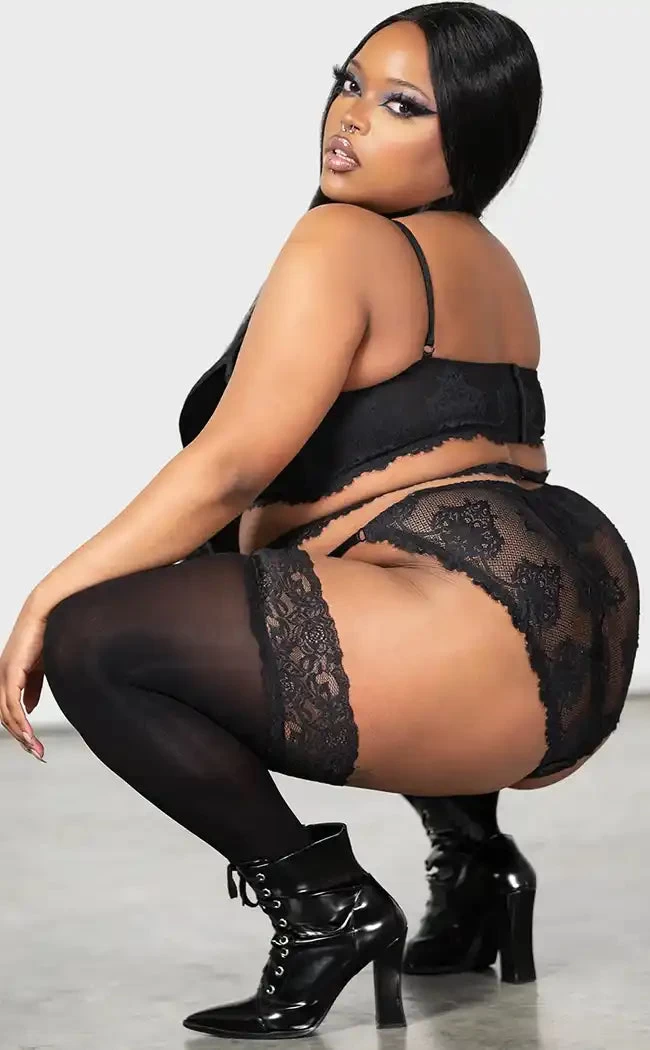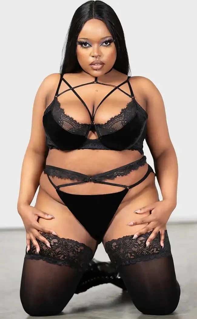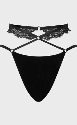 Turn into a demon dominatrix in the Killstar Affinity Bondage Panty. Conjured using a luxe stretch lace with velvet panels which stretches to perfection for a seductive and comfortable fit. Complete with accent straps this piece will make them beg.