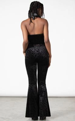 Show off yer street cred in the Alley Cat Halter Top! Soft, stretch velvet is embossed with a black-on-black leopard print, forming this V-neck halter with a statement V hemline. The faux leather neck strap is adjustable and features metal hardware.
