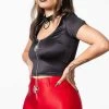 Show off yer street cred in the Alley Cat Halter Top! Soft, stretch velvet is embossed with a plum purple leopard print, forming this V-neck halter with a statement V hemline. The faux leather neck strap is adjustable and features metal hardware.