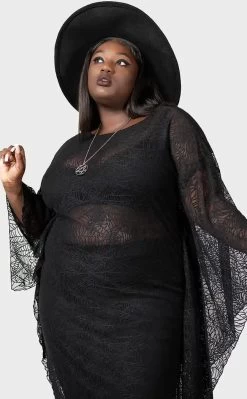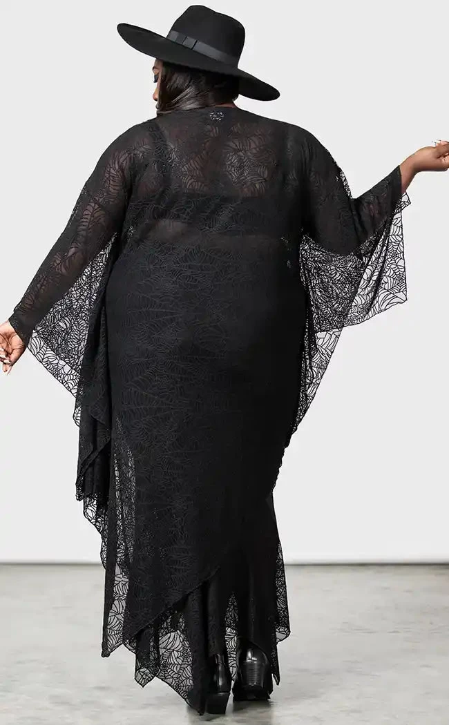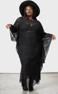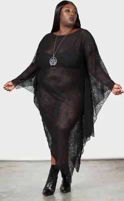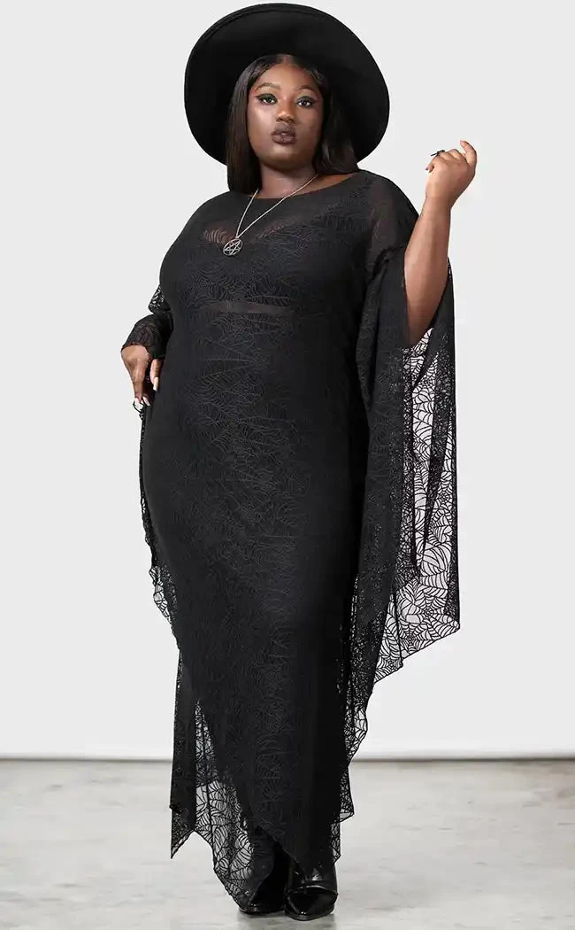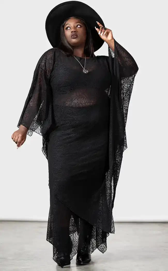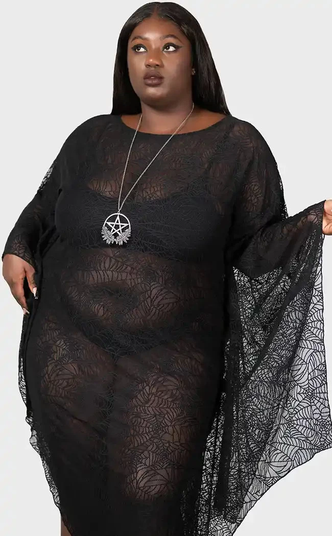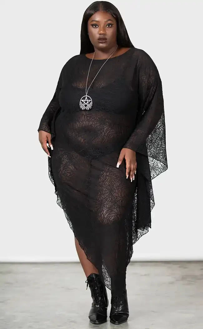 This standout black maxi dress from Killstar is made from a soft stretch see-through spiderweb lace fabric with a relaxed batwing tunic fit that drapes to perfection. Totally versatile, this stunning maxi dress has dropped shoulders, long sleeves and hanky hem. This beautiful black fishnet dress is sure to turn heads!