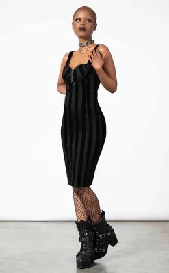 Hug yer bod in undead threads with the Back From The Dead Bodycon Dress! This statement denim dress is flocked with black-on-black stripes, forming a body-hugging midi dress with a kick pleat. The dress secures with a rear zip and features an inverted cross zip pull at the front.