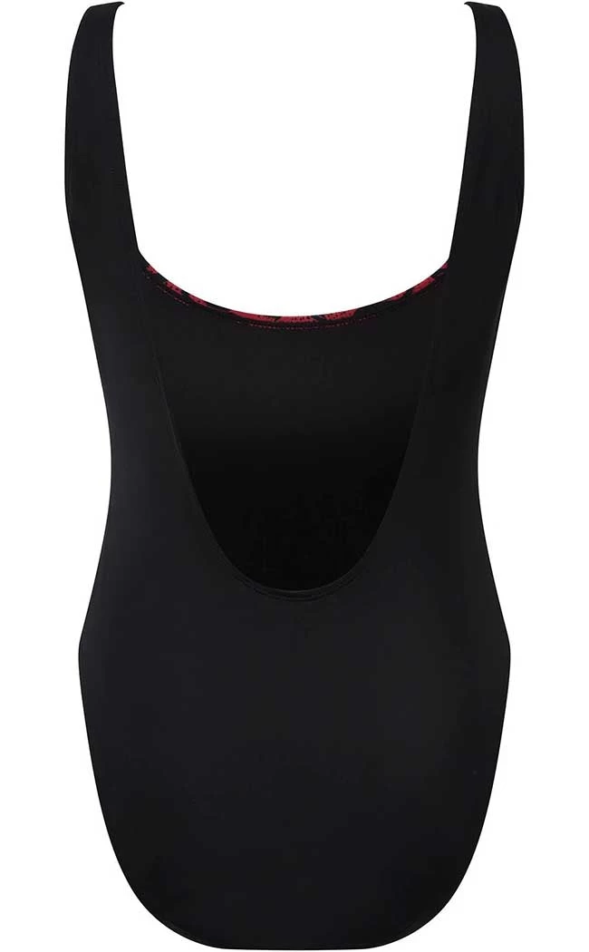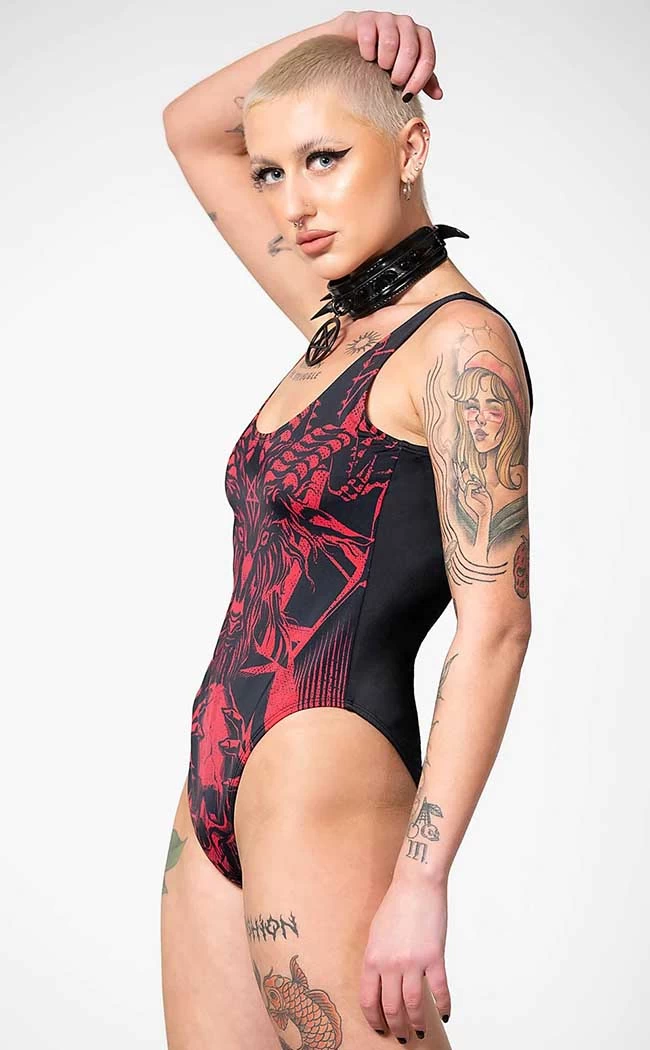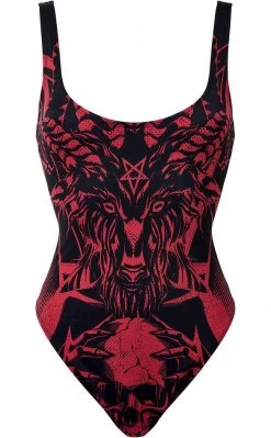 Show yer teeth at the beach in the Beach Beast Swimsuit! This wicked one-piece features a blood-red print of Baphomet, a deep round neckline, and a scoop style back. The soft stretch nylon fabric will hug yer bod for a comfortable fit while you ravage the beach and hunt by the pool.
