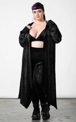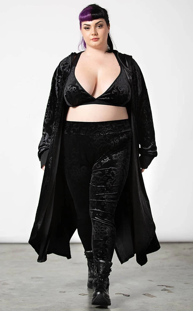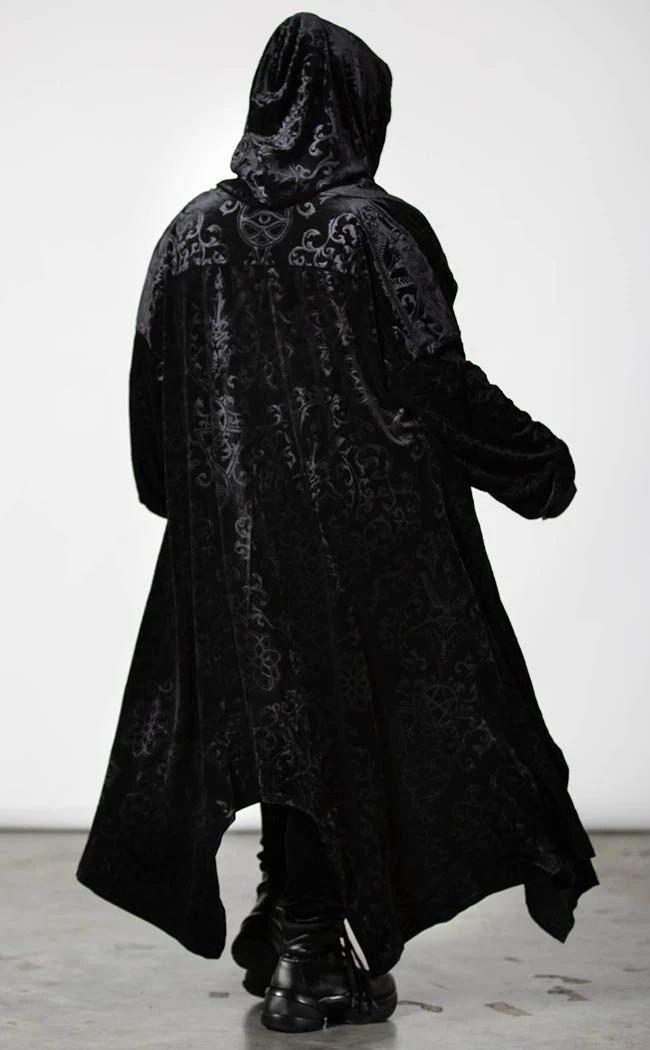 Get coffin cosy in the Blasphemia Longline Cardigan! This oversized cardi is made with super soft velvet, embossed with a wicked burnout pattern. The open front, oversized hood and hanky hem will have you looking aloof and mysterious while staying snug in the cooler months.