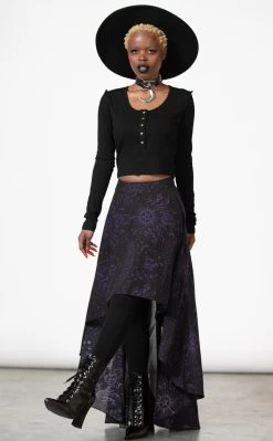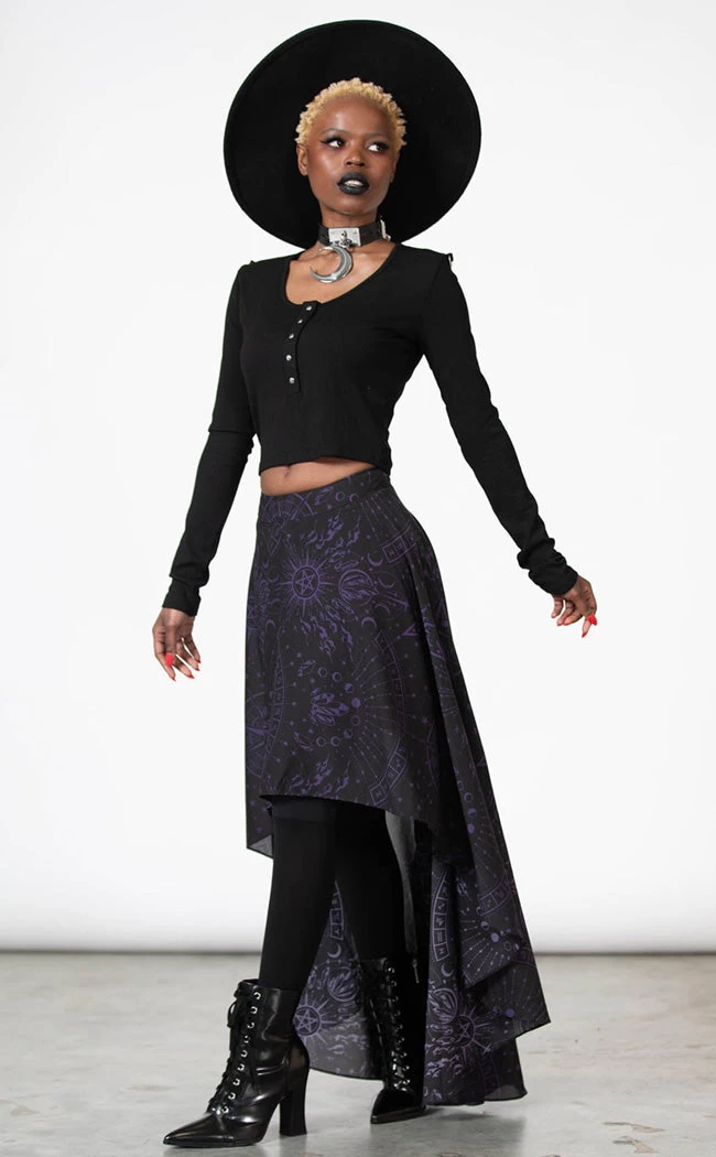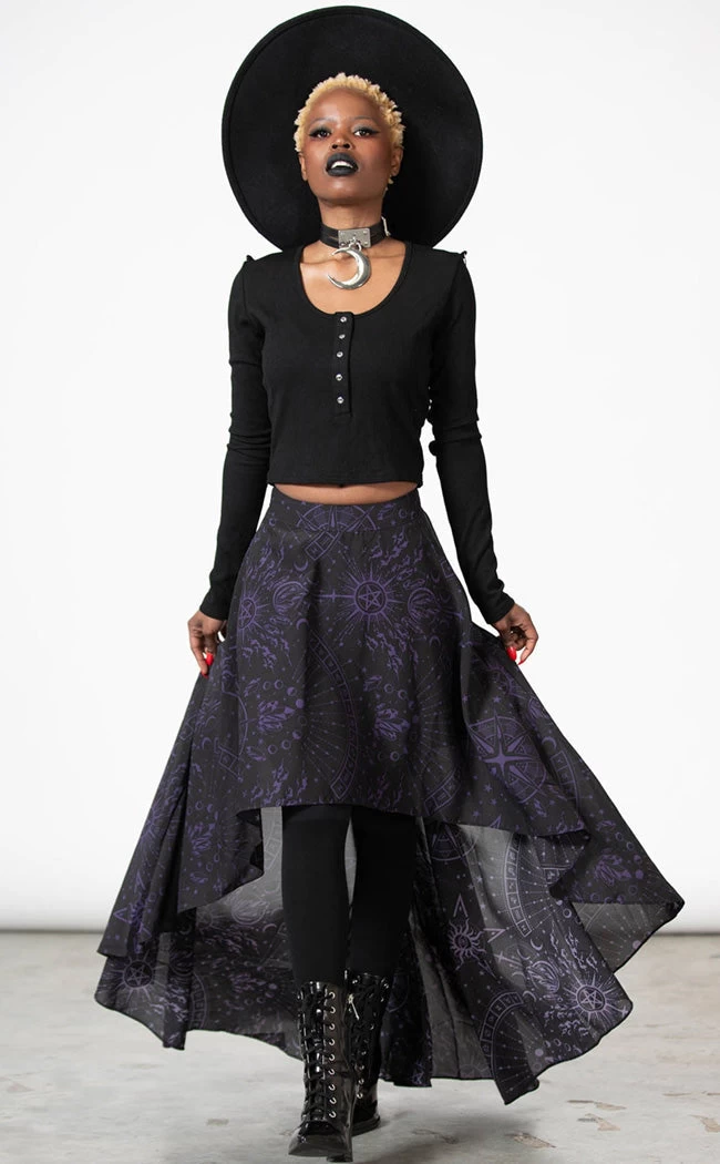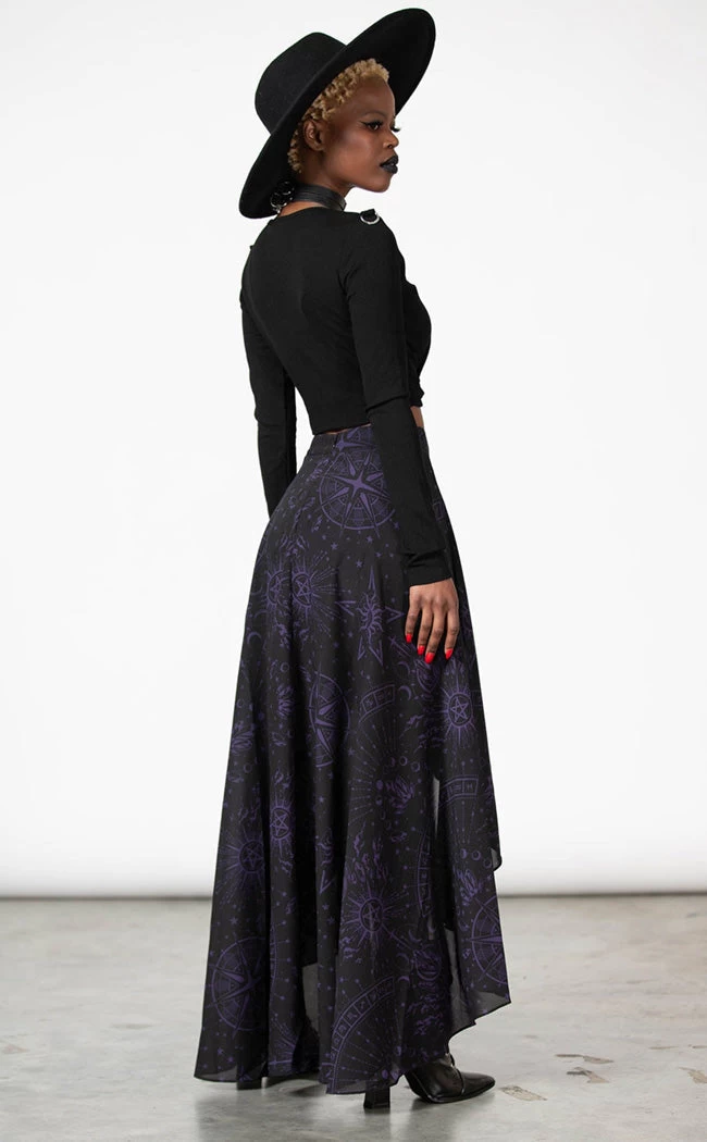Sweep through galaxies in the Corene Chiffon Maxi Skirt! Soft, lightly stretchy black mesh is printed with a custom celestial print to have ya feeling like a lunar goddess. This flows over the legs in a hi-lo waterfall hem, featuring an opaque black mini skirt underneath for modesty. Pair with black tanks, blouses n’ crops to let the print take centre stage!