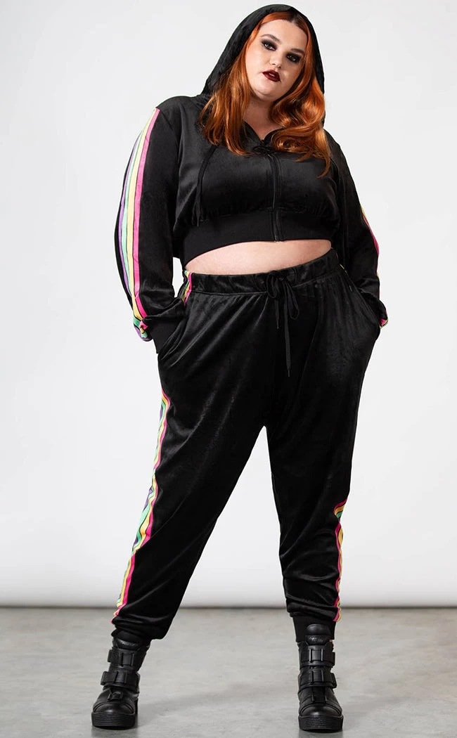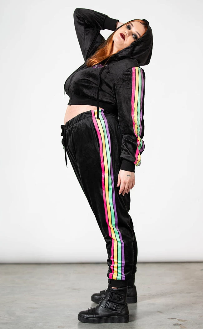 Lounge around yer prism in the Coven Chill Velour Hoodie! Soft, stretch velour forms this slightly cropped hoodie, featuring a large hood, an elasticated waistband and a full-length zip topped with a pentagram pull. Cute, bright deets like athletic rainbow stripes and a statement embroidered heart demon patch prove that goths don’t just wear black!