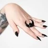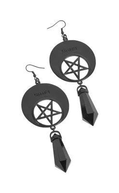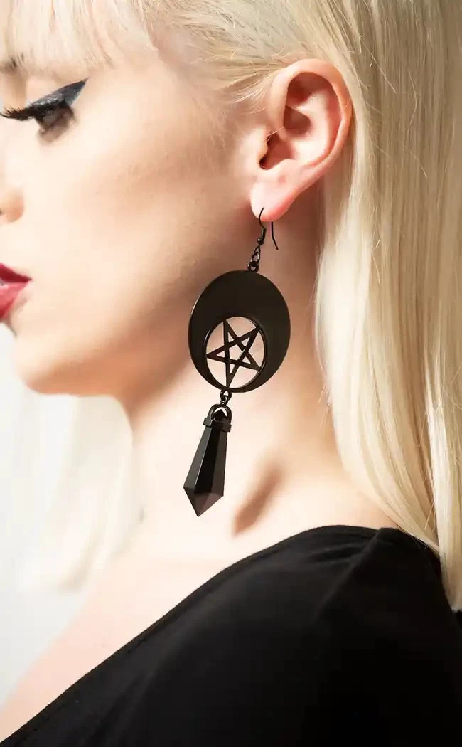 These statement black metal earrings feature a hanging crystal charm, crescent moons and pentagram detail.