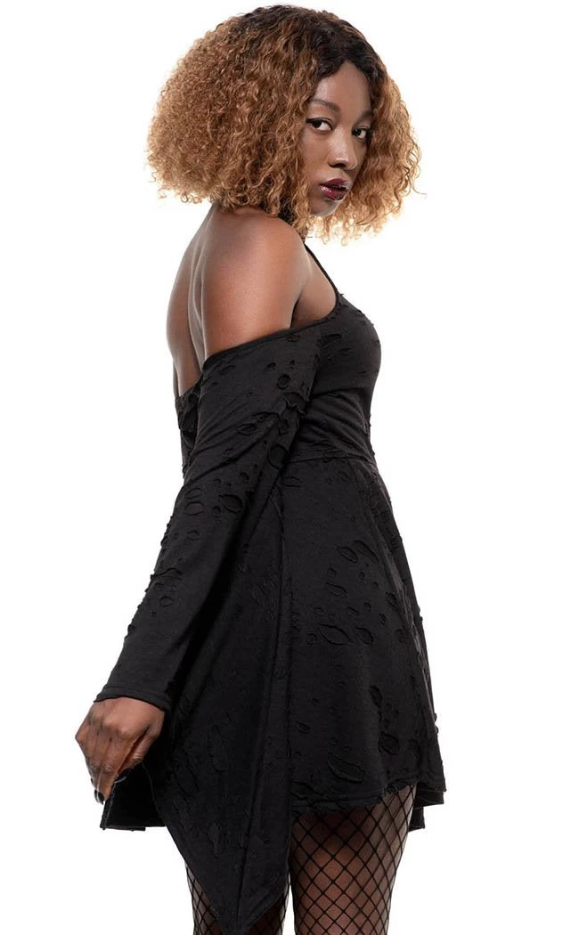 Worship yer bod in this wonder of dystopian chic! The super-soft fabric hugs yer bod in this fitted minidress, cold shoulders and a halter neck creating a flattering silhouette. The sleeves flare out in a dramatic waterfall, perfect for casting spells with drama and gesturing wildly.