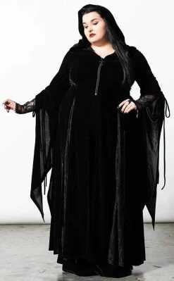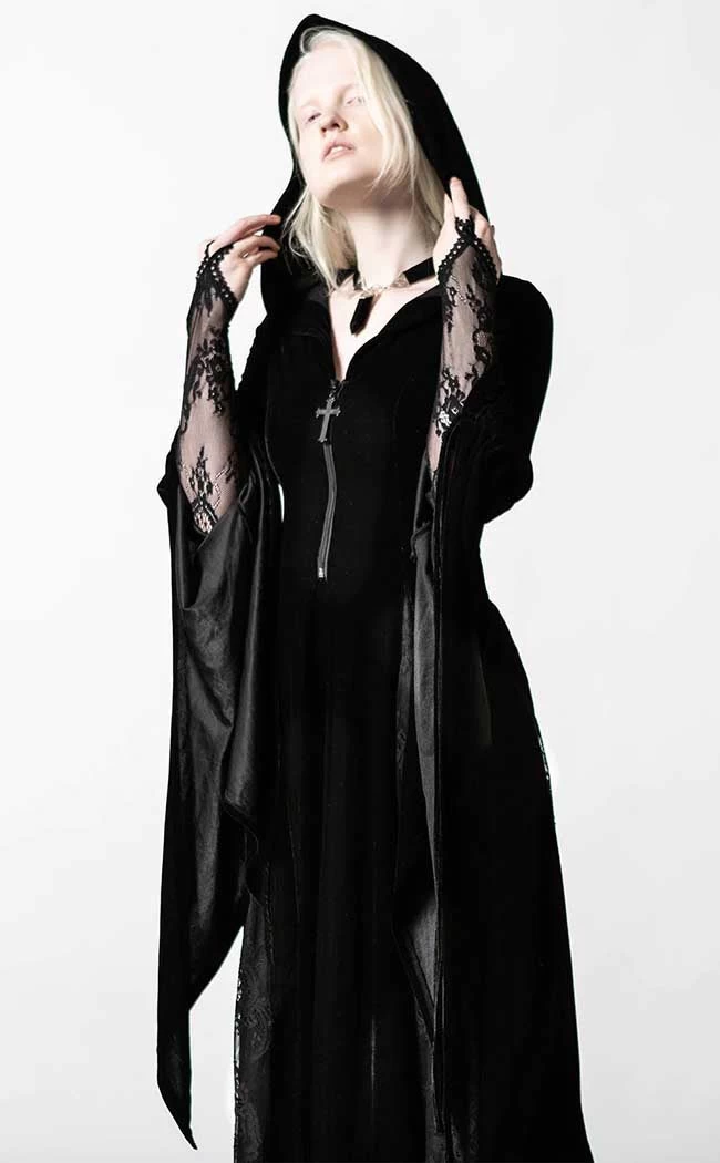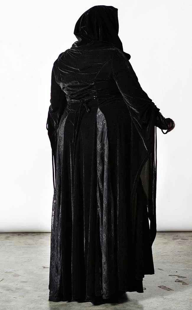 Be your best bewitching self in the Dark Descent Hooded Duster! This luxurious statement piece is made with soft velvet, forming statement waterfall sleeves with lace panels. The rear laces up and the front secures with a zip topped by a cross pull charm while layers of lace and velvet form a dramatic, flowing skirt.