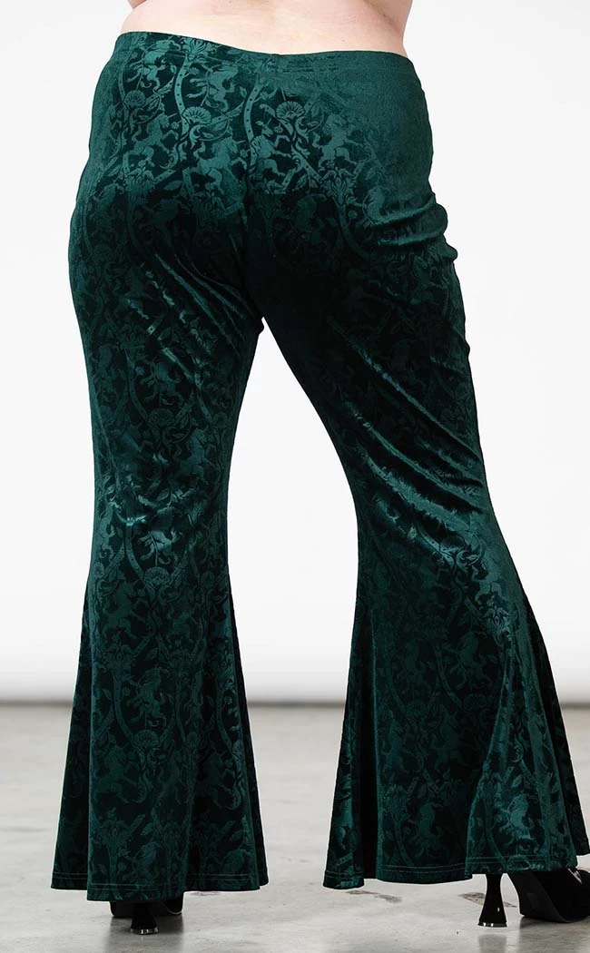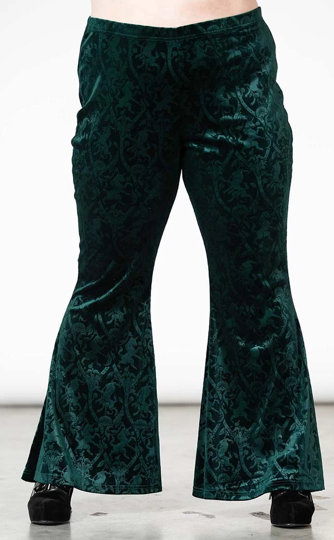 The Dark Dynasty Flares will have you looking like a wicked sorceress! Soft, stretch velvet is embossed with a statement beast motif, forming into flowing flares, a high waistline and a comfortable elastic band.