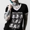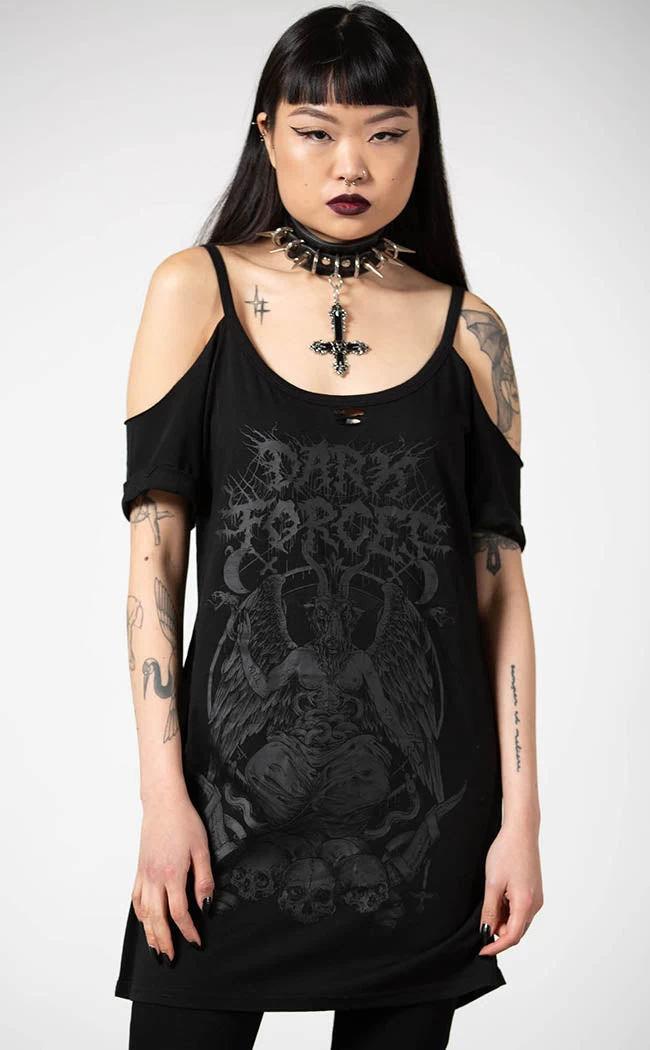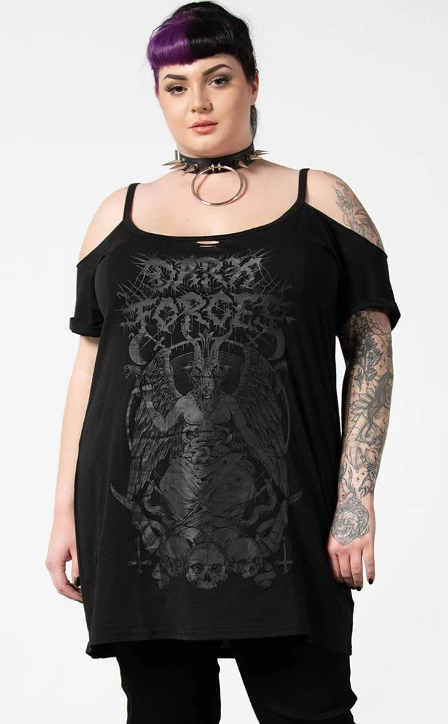 Get down with the Devil in the Dark Forces Distress top! This cosy top features a bardot neckline, thin shoulder straps, distressed detailing at the neckline and a wicked black-on-black print.