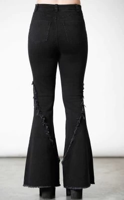 Add an apocalyptic flair to yer flares! The Dasia Lace-Up Bell Bottoms are yer new fave statement piece, made with soft stretch denim that forms generous flares and exaggerated frayed details. The high waist features an adjustable lace-up detail but also secures with a side zip for easy on/off.