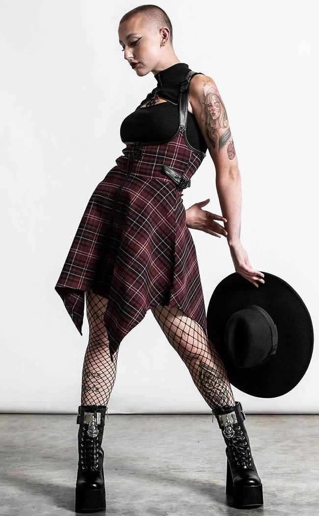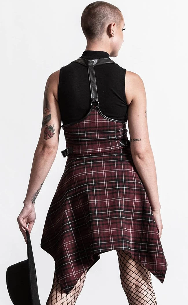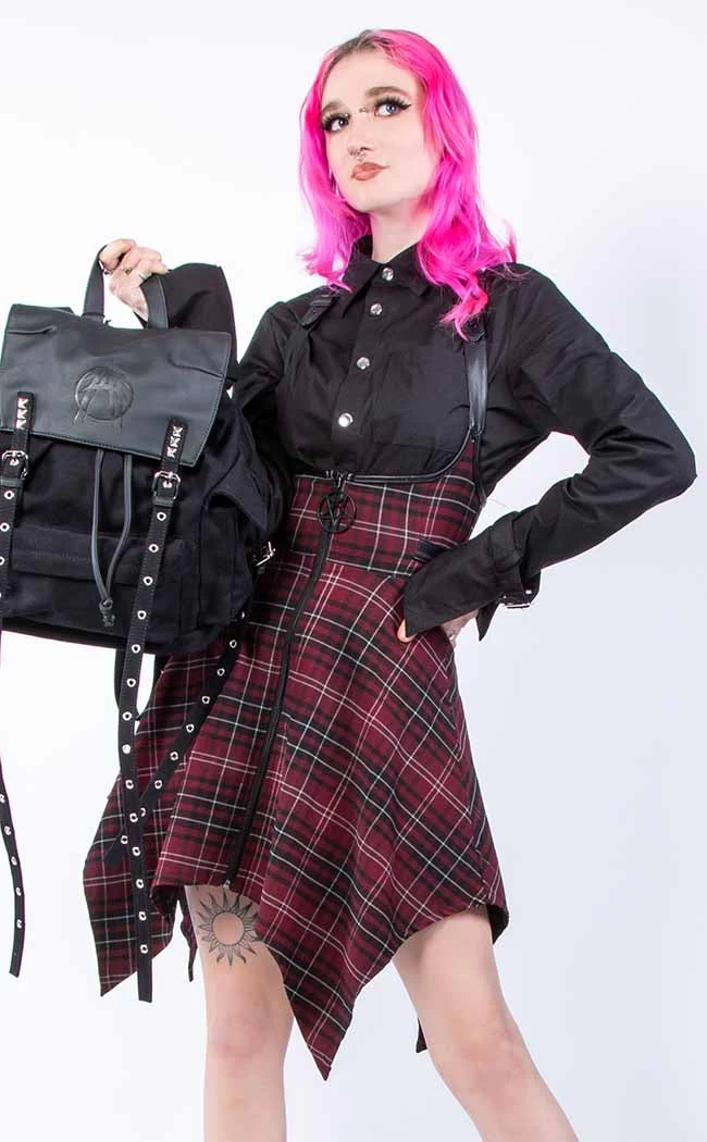 This punky skirt will be an instant icon in your wardrobe! The hem of the skirt is asymmetrical, flowing shredded around yer knees. The upper bodice is fitted to hug yer bod, with faux leather straps and black hardware including full front zip with a pentagram charm.