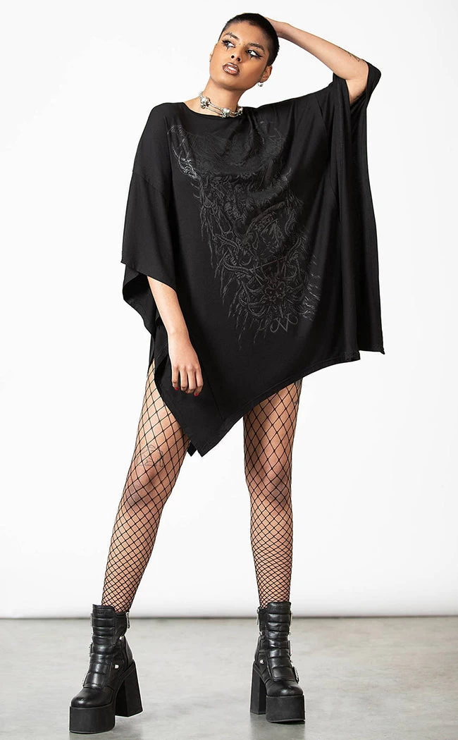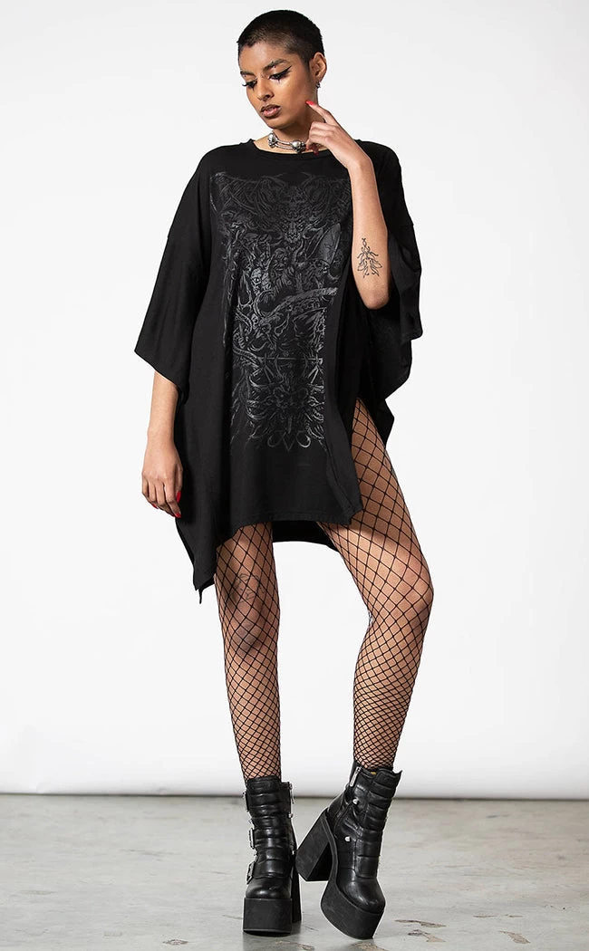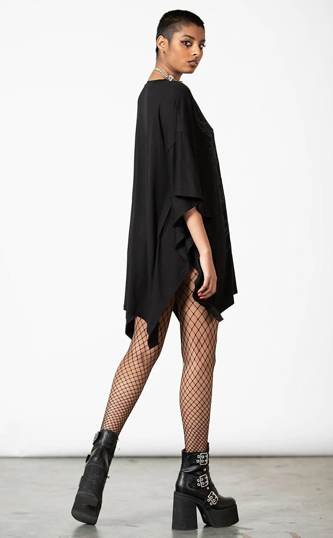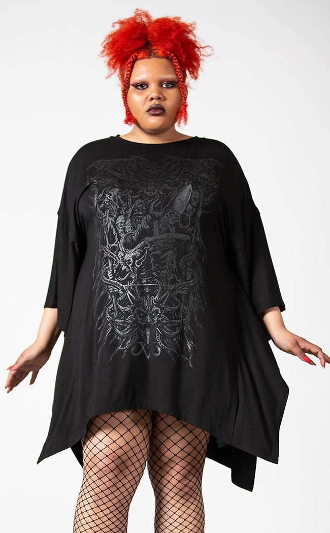 Look devilishly good in the Devil’s Haven Tunic! This dress is super stretchy and ridiculously soft, flowing into a hanky hem and a cosy, relaxed fit. The front is printed with a wicked black-on-black motif that goes with everything and anything.