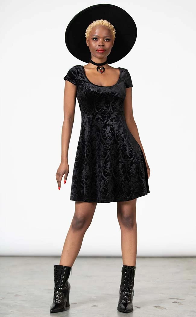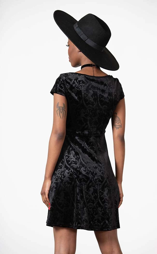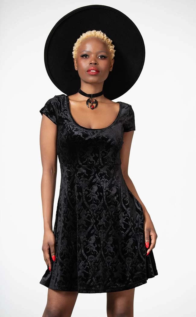The Devilry Skater Dress is your new fave witchy stylin’ staple! Soft, stretch velvet embossed with a statement beast motif forms a large scoop neckline, cap sleeves, and a fitted waistline.