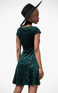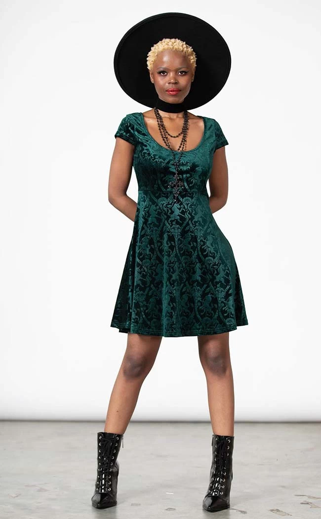 The Devilry Skater Dress is your new fave witchy stylin’ staple! Soft, stretch velvet embossed with a statement beast motif forms a large scoop neckline, cap sleeves, and a fitted waistline.