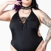 Look cute n hellish in the heat in the Doro Swimsuit! This sexy one-piece features a lace-up V neckline, cutout details and a black-on-black print. The soft nylon blend hugs your bod in a comfortable fit and the whole piece secures with a tie back and an adjustable halter.