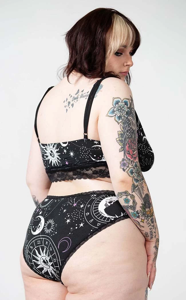 The Eclipse Lace Panty will sprinkle a little stardust on your lingerie looks! A stellar custom print spreads over super soft and high-stretch fabric, trimmed with black lace for an extra touch of luxury.