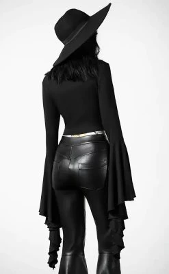 Tell their misfortunes in the Elemental Eclipse Crop Top! Soft, stretchy black material with a cutout feature in mesh of the mercury glyph. Huge waterfall bell sleeves and a high neck complete this witchy look.