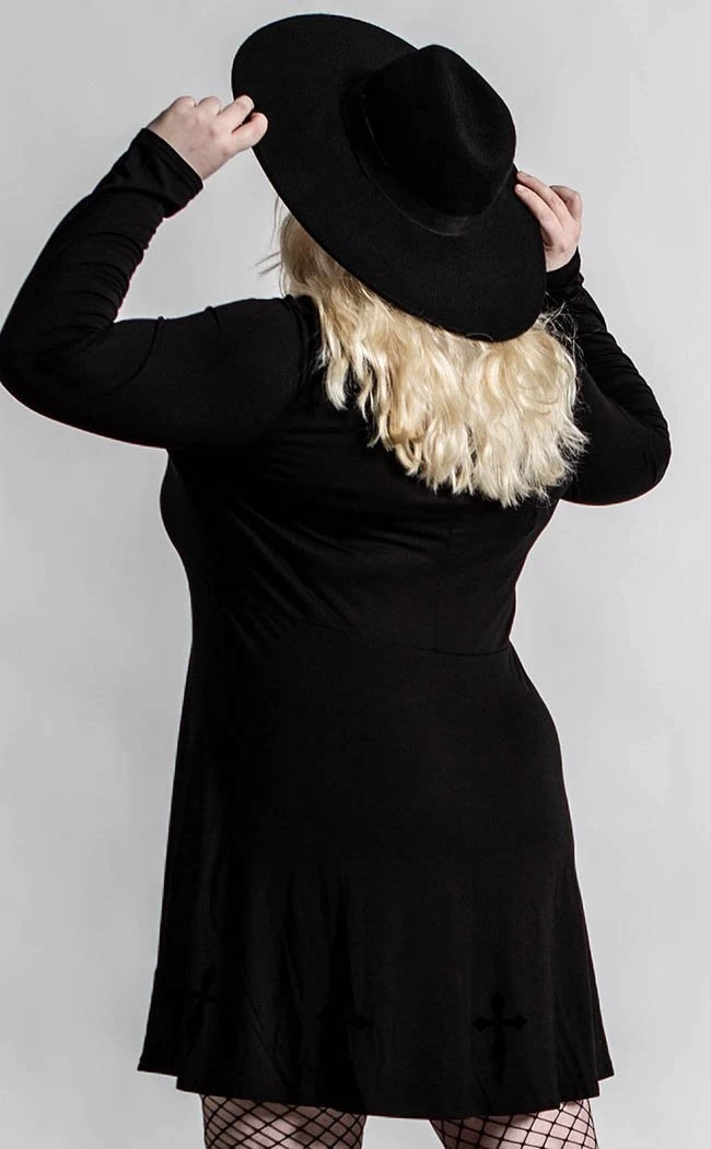 Get in the vampire spirit with the Elissabat Collar dress! The exaggerated bat collar is the star of the show, sitting above a keyhole chest. The rest of the dress is a soft stretch fabric, featuring long sleeves and a skater length skirt trimmed with crosses. Easy to dress up and down for any night haunt!