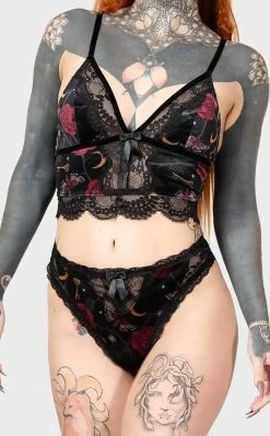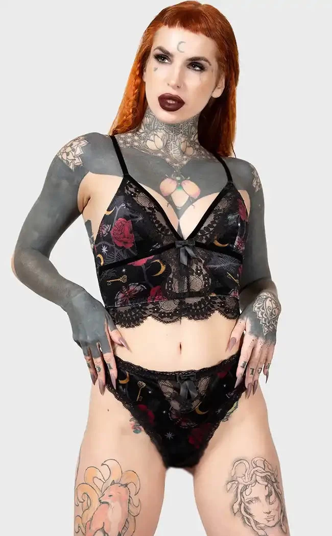 For the Hedge Witch in your soul. Cottagecore meets witchy goddess in these romantic soft velvet panties. With a cheeky thong back, lace trim, and a gorgeous custom print with lavish roses, moons, keys and moths.