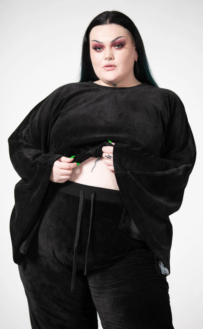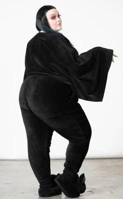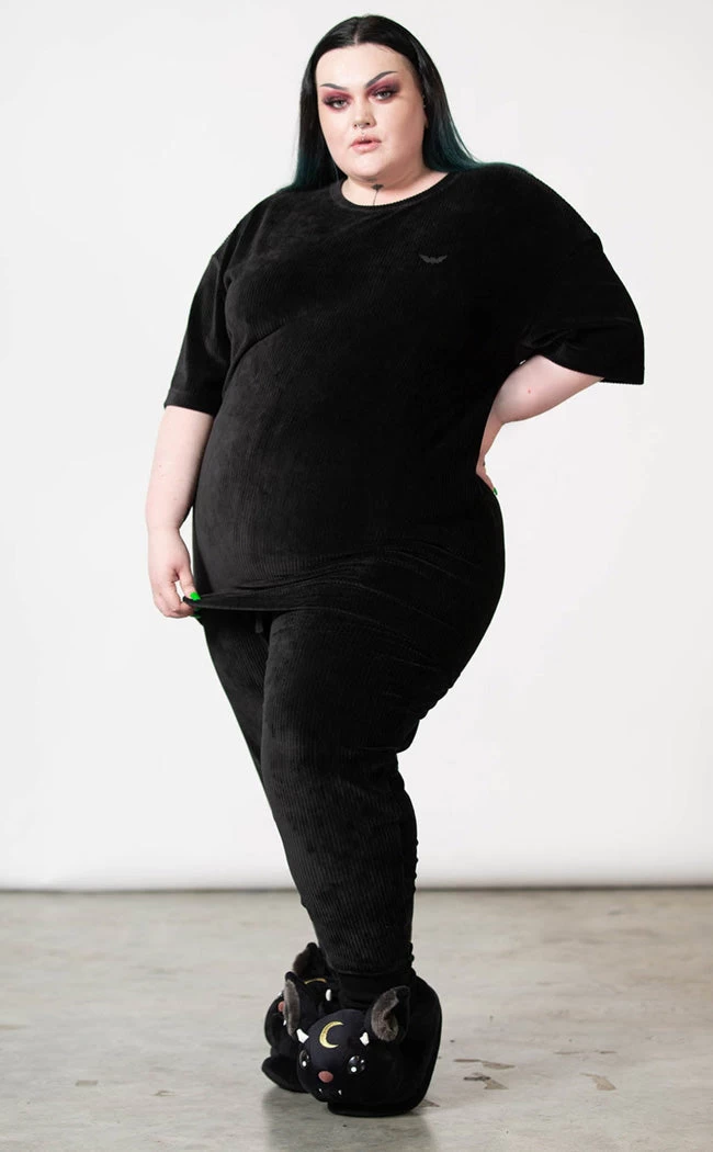 The Eternal Rest Leggings will have you lounging in lethal luxury! Formed from soft ribbed velour, these leggings sit high on the waist with an elasticated band and drawstring for a secure and cosy fit. The ankles are cuffed and a metal bat emblem is the spooky cherry on top.