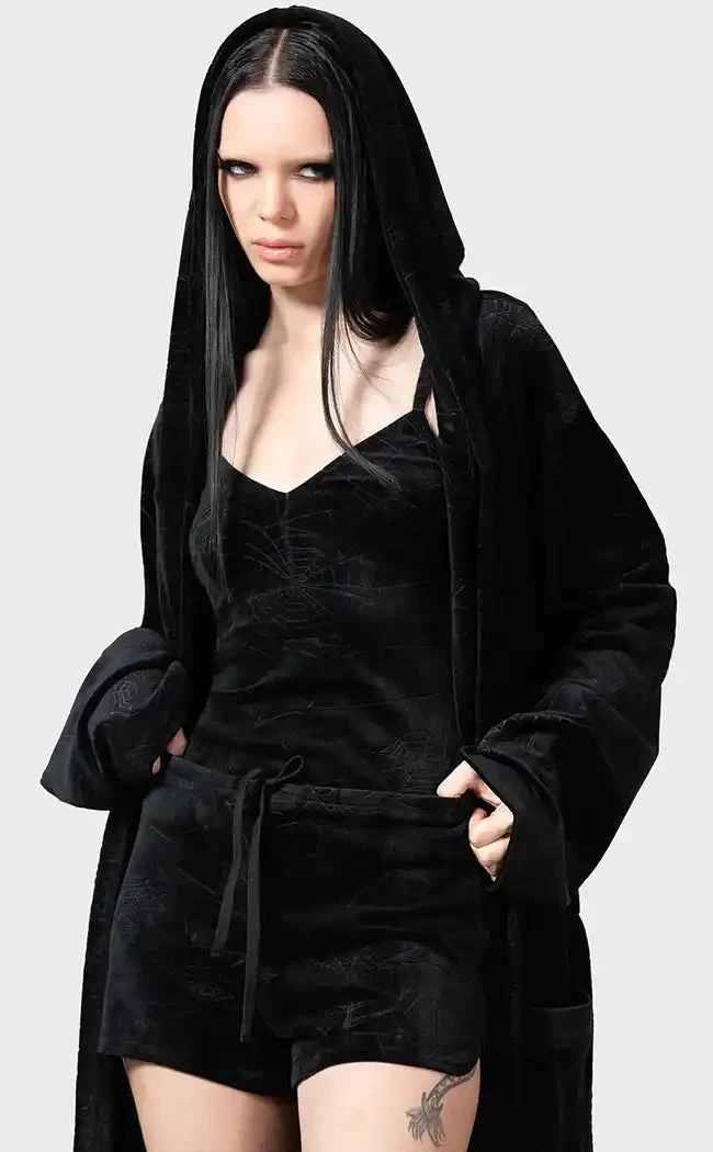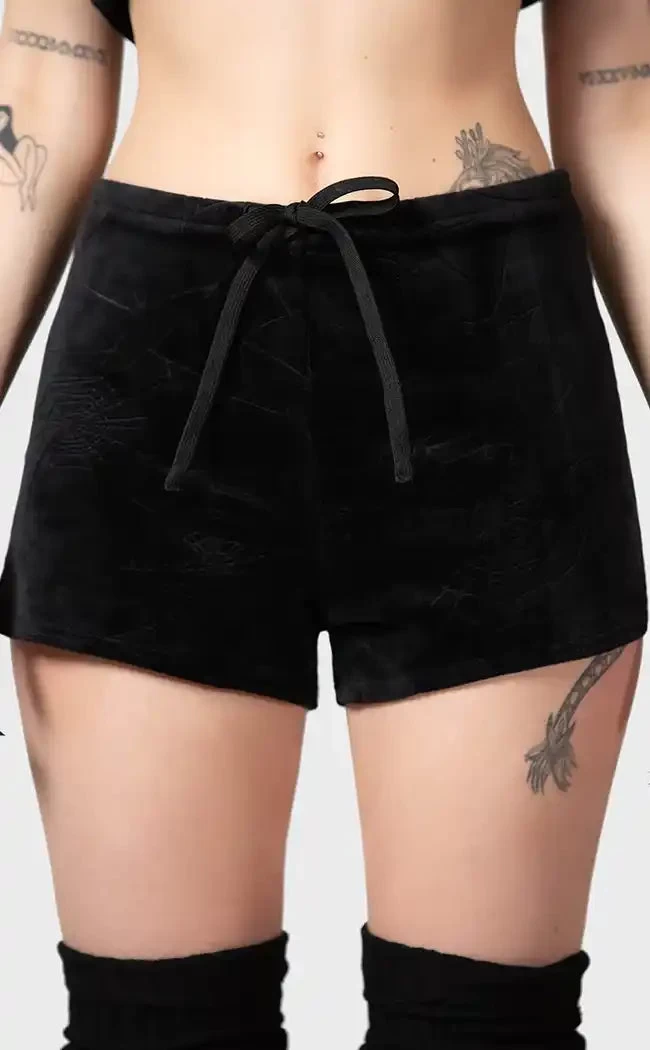 Drape yourself comfortably over yer crypt in the Eternal Sleeper Shorts! Formed from soft stretch velour with a spiderweb embossed print, these shorts sit high on the waist with an elasticated band and drawstring for a secure and cosy fit.