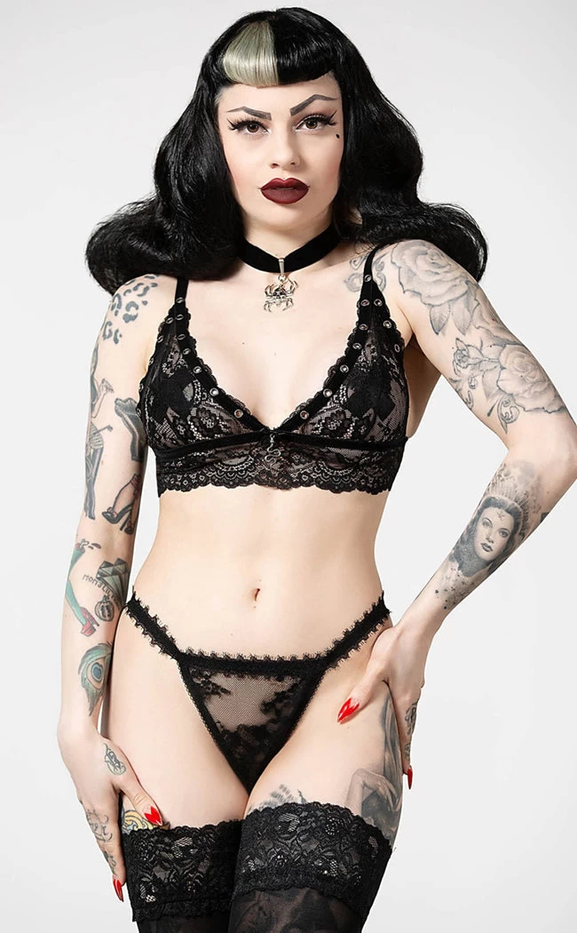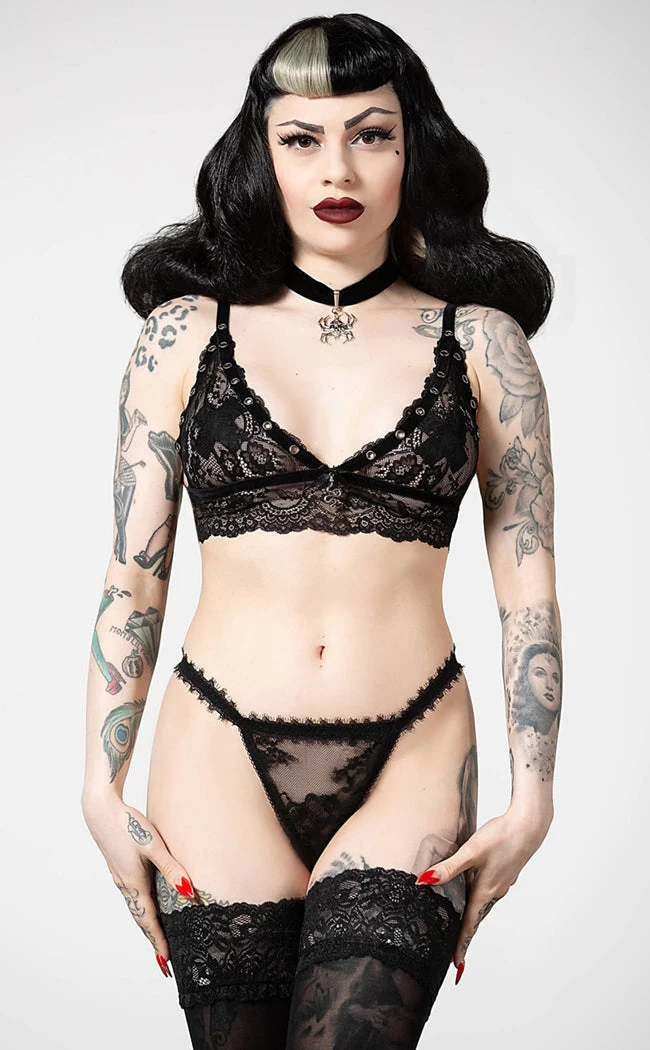 Rule over your own private realm in the Etienne Bralet! Feel regal in soft touch black lace and adjustable straps that stretch for the perfect comfort fit. Metal rivets and a snake charm add the final crowning touch to this seductive piece.