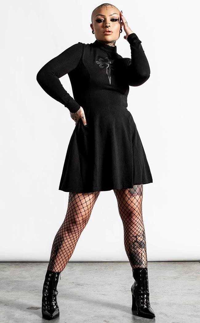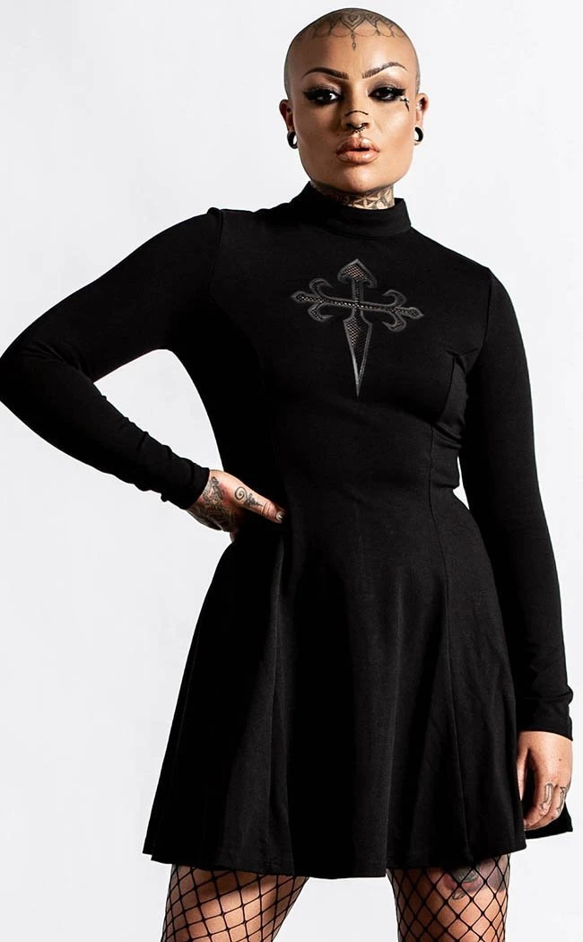 Host yer own black mass with the chic Evanna Cross dress! The woven stretch fabric clings to yer figure, flaring into a skater skirt at the fitted waist. The long sleeves and high neck keep the demons in and your body warm while the showstopping cross cutout is completed with a sexy mesh panel.