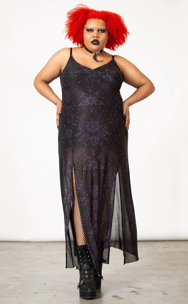 Bring me to life! The Evenescent Mesh Maxi Dress was conjured from soft, lightly stretchy black mesh printed with a custom celestial print to have ya feeling like a lunar goddess. Featuring adjustable shoulder straps, a double slit skirt and an opaque slip, this dress is effortlessly glamorous and can be dressed up or down with ease.