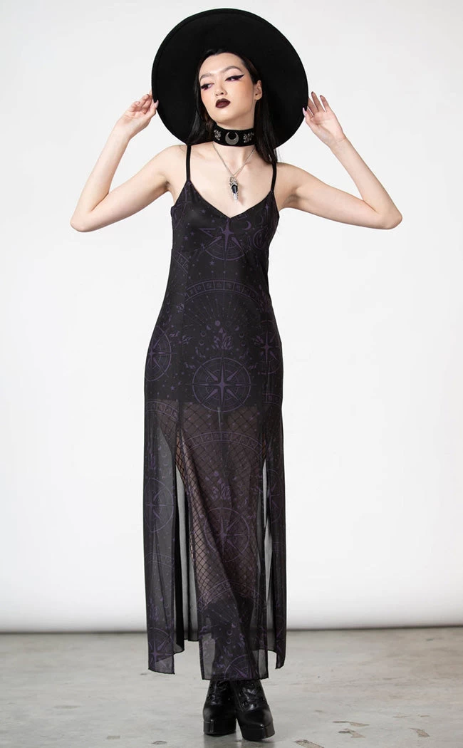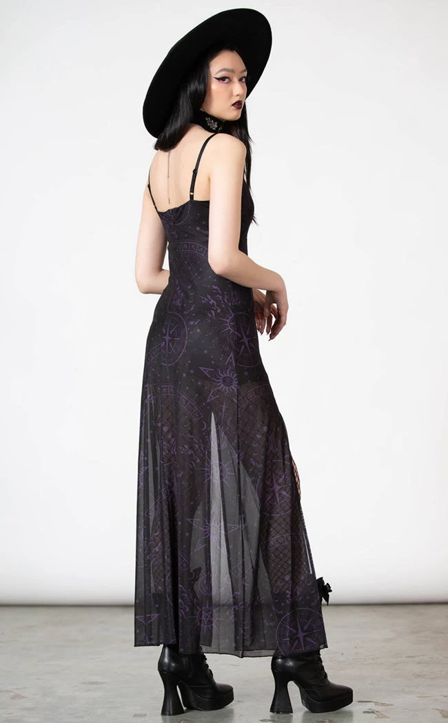 Bring me to life! The Evenescent Mesh Maxi Dress was conjured from soft, lightly stretchy black mesh printed with a custom celestial print to have ya feeling like a lunar goddess. Featuring adjustable shoulder straps, a double slit skirt and an opaque slip, this dress is effortlessly glamorous and can be dressed up or down with ease.
