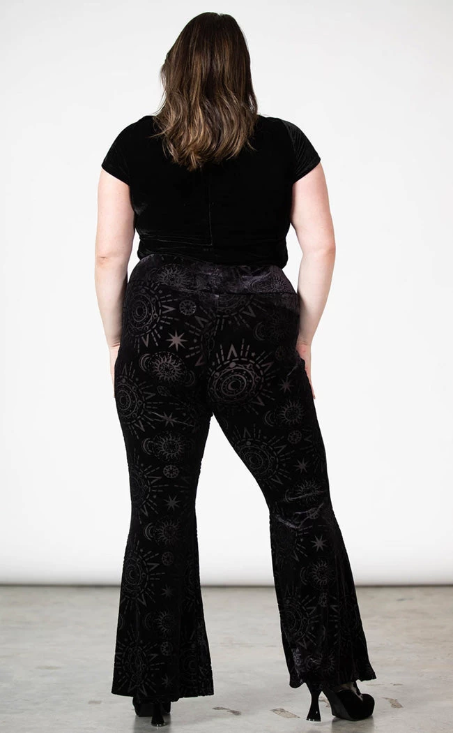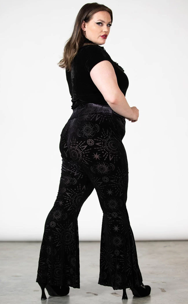 Stare ’em down hard in the Evil Eye Burnout Bell Bottoms! Soft, stretch velvet embossed with a witchy burnout pattern forms these gorgeous flares, sitting comfortably on the waist with a high, wide waistband and worshipping yer legs with a flattering fitted silhouette.