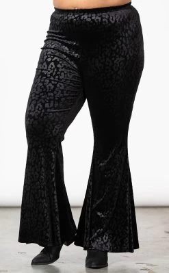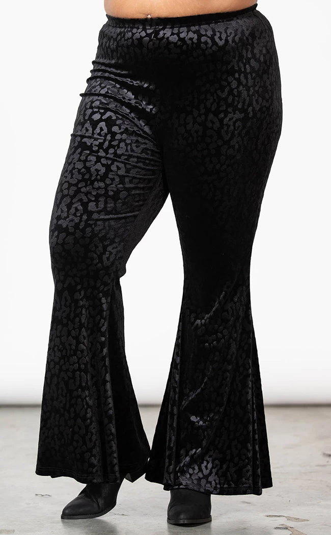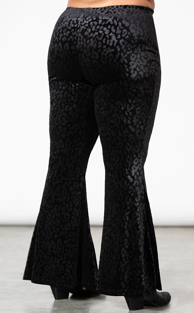 Show yer teeth in the Ferine Bell Bottoms! Soft, stretch velvet is embossed with a black-on-black leopard print, forming an elastic waistband and wicked flares.