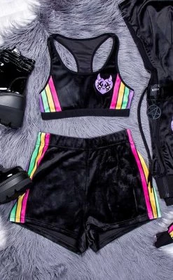 Rock yer body right in the Groovy Velour Bralet. This sporty piece is made with a soft velour fabric, featuring a racerback, rainbow stripes, a cheeky demon heart embroidered on the chest and an elasticated band with “Killstar” embroidery.