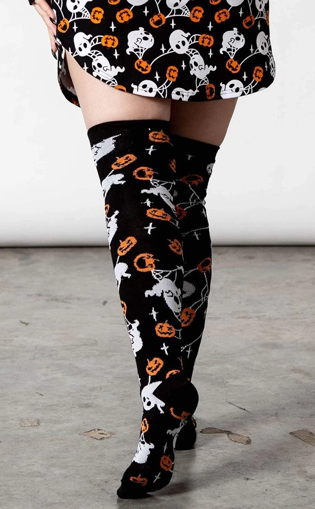 Get yer legs nice n cosy with ghosts and pumpkins, the only friends you’ll ever need! Made with a soft acrylic blend, these socks are super stretchy and go all the way over the knees.