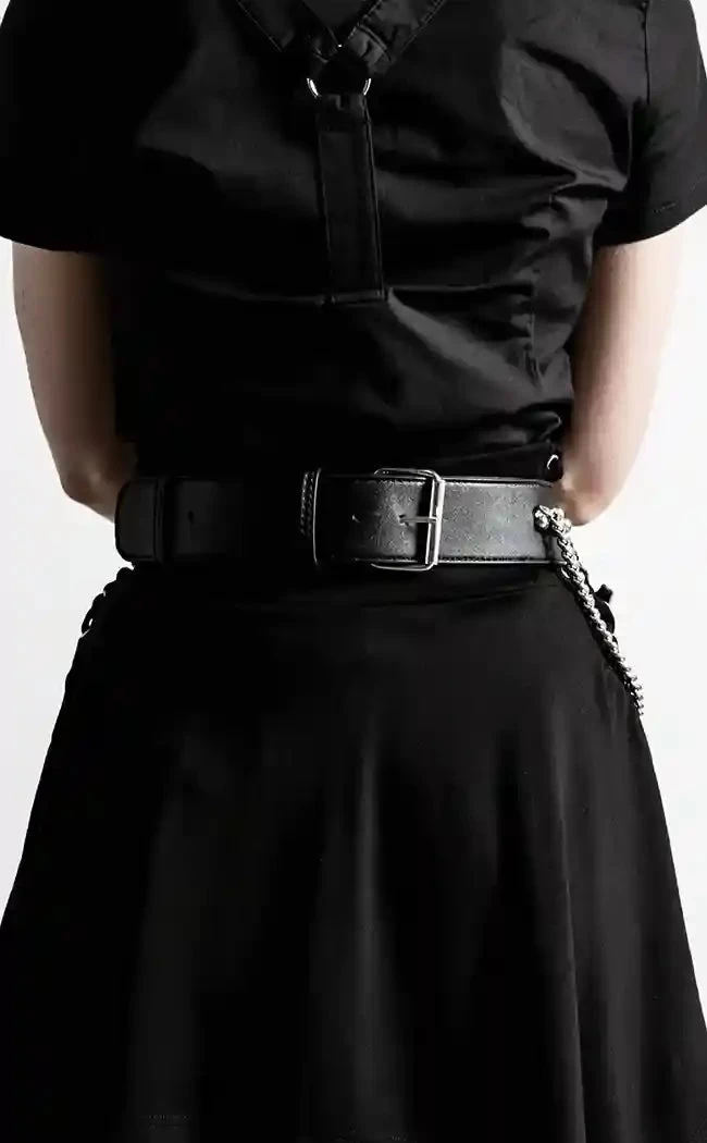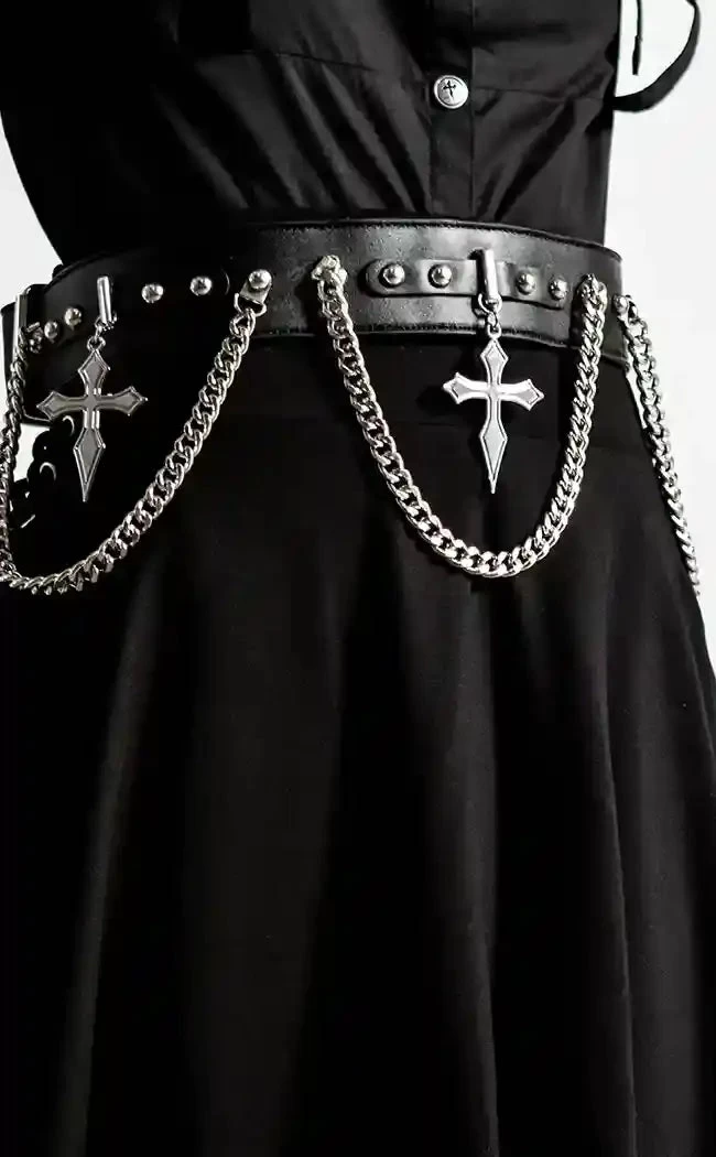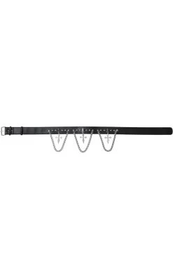 Add some drama to yer bag o’ tricks! Exaggerated cross decals and draping chains hang from this studded belt, securing with an adjustable belt buckle.