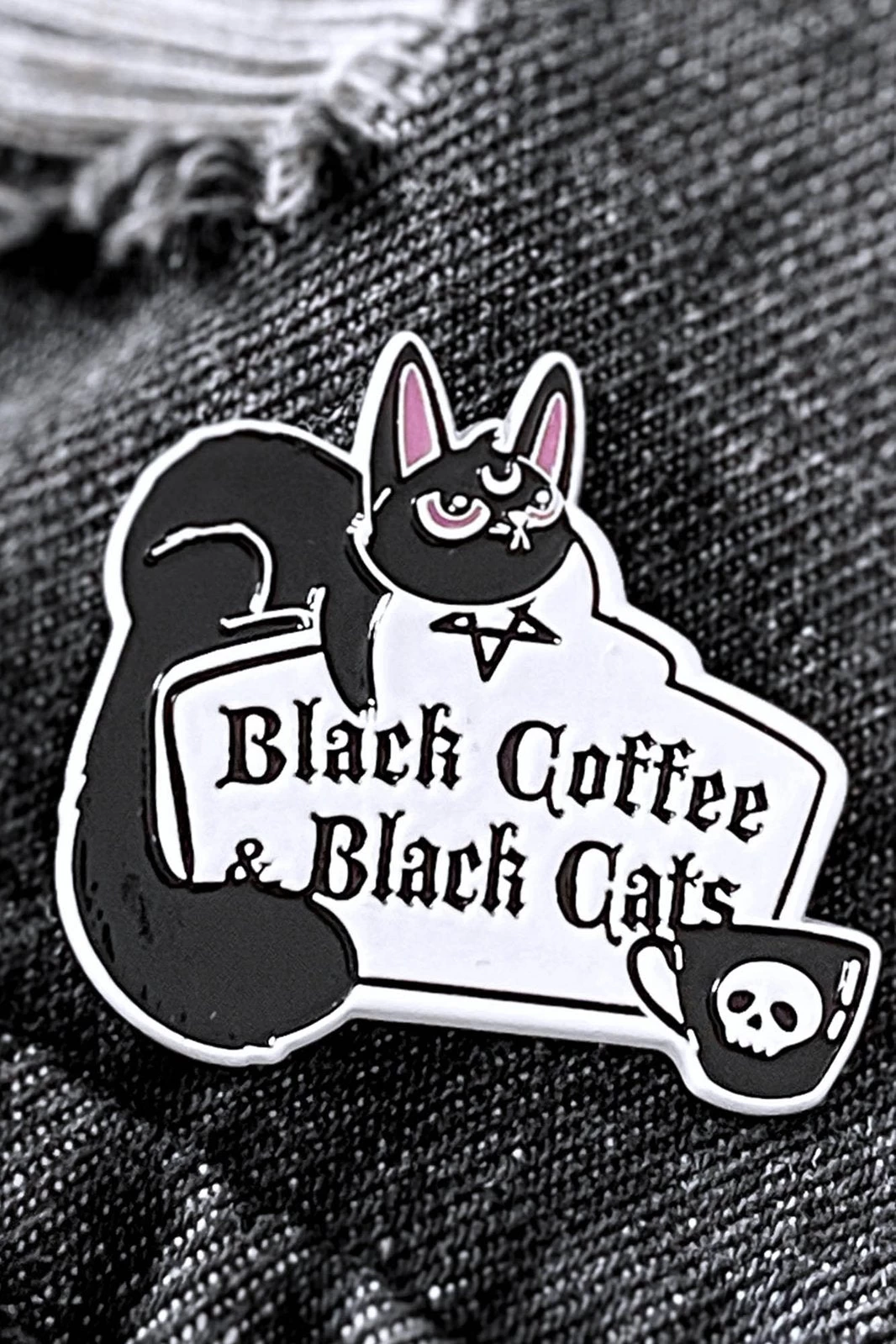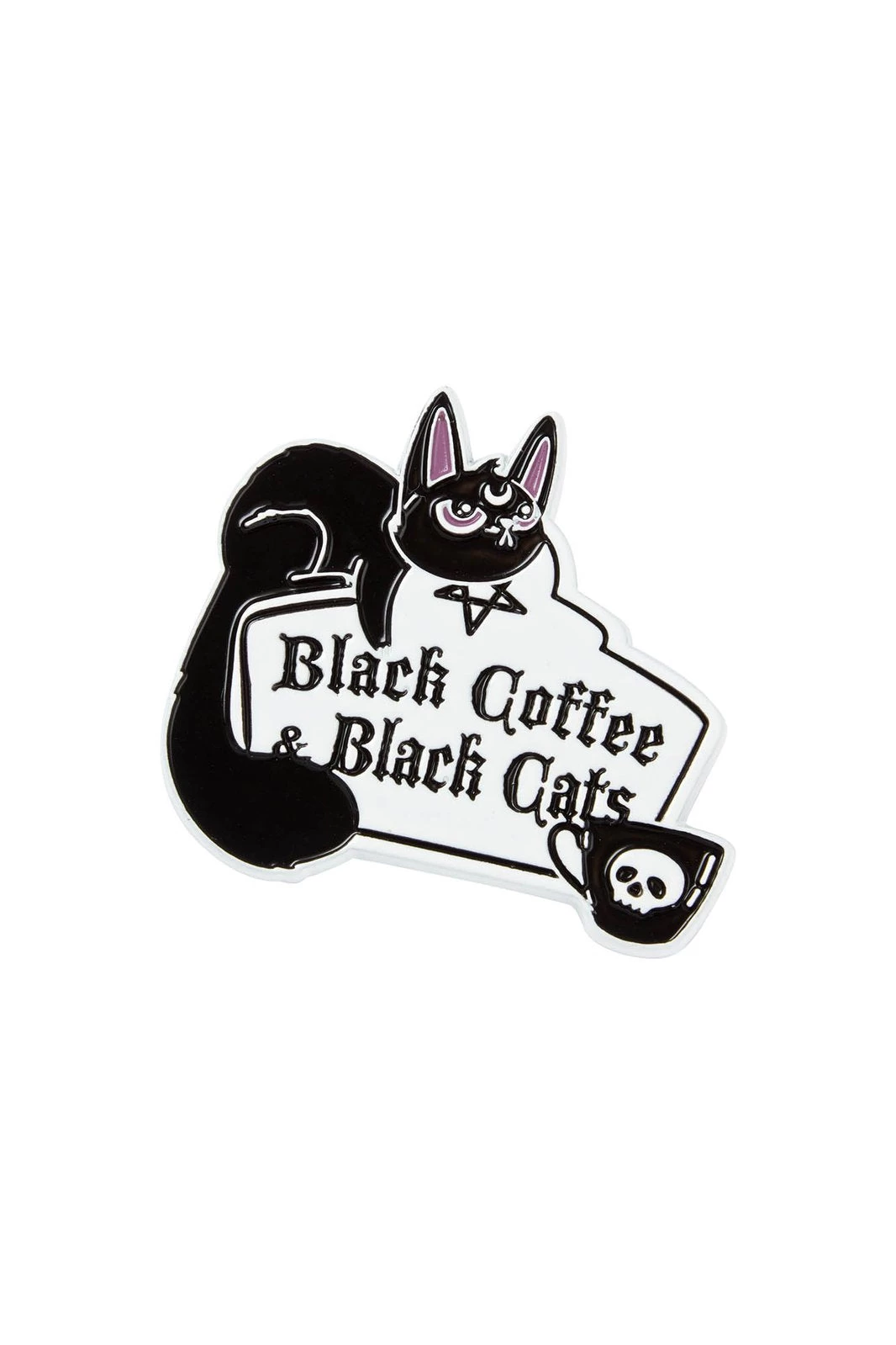 Statement cat lapel pin, in white and contrasting black enamel with purple accents. The ideal way to add some cute vibes to yer fav looks!