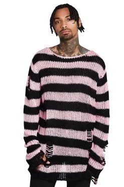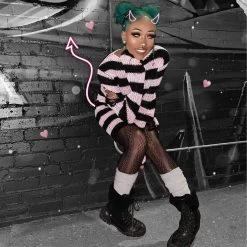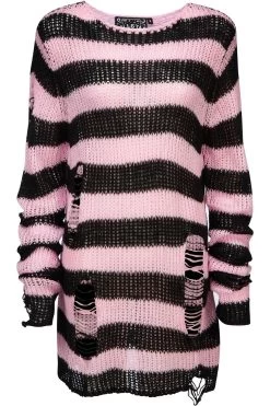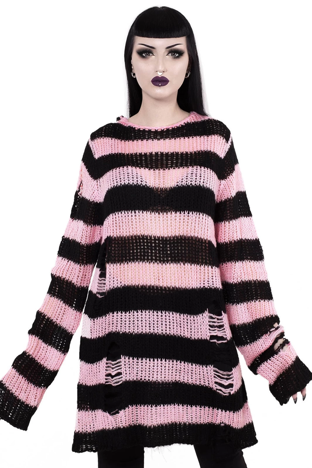 Channeling some 90s grunge with the ‘Courtney’ soft-knit sweater, perfect for layering – or wear as a statement piece. Contrasting black and muted-pink striped body; with extra long length so can easily be dressed up or down. With distress detailing and low neckline. Ideal for festivals, midnight promenades with the moon and hungover Sundays.