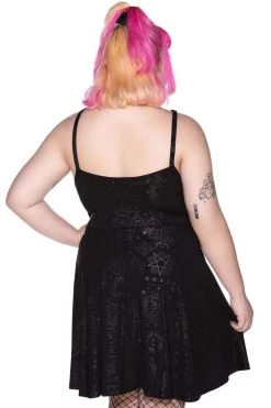 Channel your inner goddess with the ‘Covenant’ skater dress; composed of a soft stretch jersey material for a flattering + comfortable fit, guaranteed to keep heads rollin’ when yer out! Complete with custom black-on-black print, strategically placed pentagram straps to the chest and a low back, to show off some skin. Very versatile and perfect from dusk to dawn!