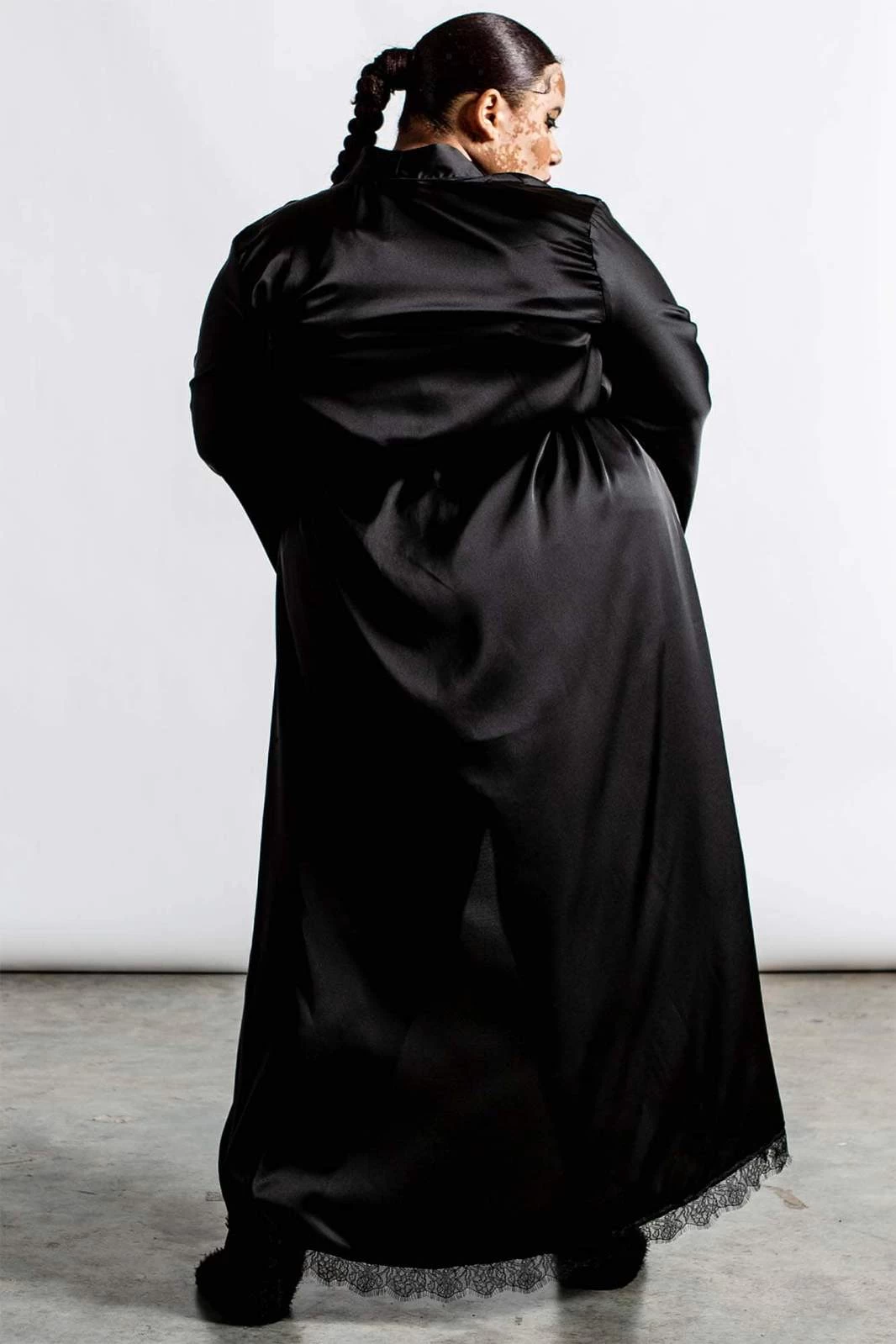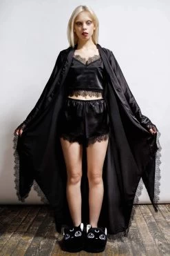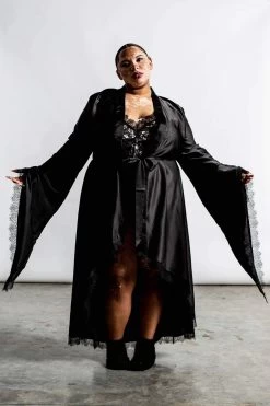 Add some dark glam to your adventures with the ‘Deadly Daze’ satin robe – in a super soft fabric, with statement waterfall sleeves, open front, and lace tie. Decorated with delicate lace trims, all black on black, of course. A seductive must-have – pairs beautifully over lingerie sets or just your birthday suit.