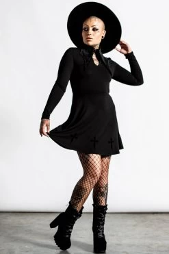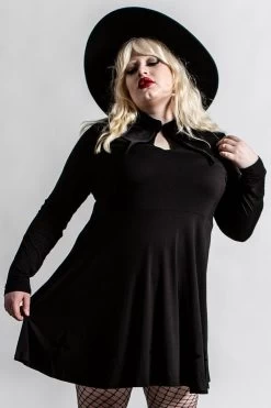 If you got it, haunt it. Feel every part divine in the ‘Elissabat’ collar dress – a dark and decadent dress in a super soft fabric, the perfect piece for any dark vamp! Complete with deadly details – exaggerated collar, hey hole detail, embroidered crosses and long sleeves. You’ll be ready to slay in this statement piece – perfect from Dusk to Dawn!
