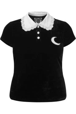 Be ready for any adventure in our ‘Esmeralda’ short sleeve top; super-stretch velvet that hugs to yer body – with a high neckline and contrasting collar, short sleeves and embroidery detail. An essential piece – easy to style depending on your mood/moon!