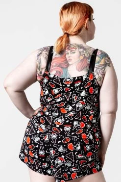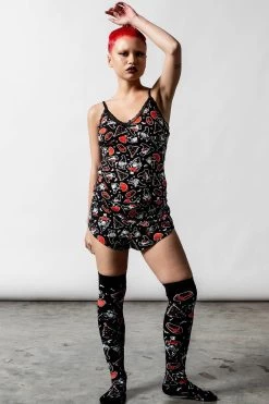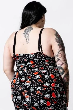 Spend all day lounging with yer coven in our ‘Gnomies’ cami top. Made from a soft stretchy material for a comfy and cute fit! Features a contrast print all over, cami straps and delicate lace trims.