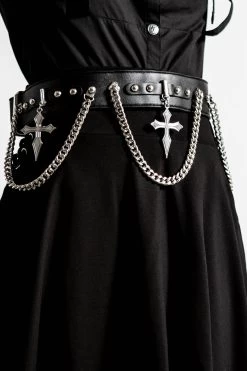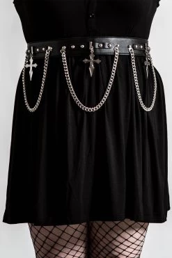 Add some instant drama to yer daily rituals; faux leather in a double-layer body with contrasting silver hardware; studded, cross charms and chainz. High Waist fit – looks seriously killer on bodycon dresses or fishnet!