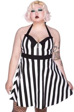 Look ghoulishly good in the ‘It’s Showtime’ dress; conjured using a super-stretch fabric which stretches to perfection for a flattering and comfortable fit. Features a low neckline with zip detailing, halter neck, flattering waistband and skater skirt. This gothic dress is a dream to style – perfect for a day out with the coven or picnics by the moon.