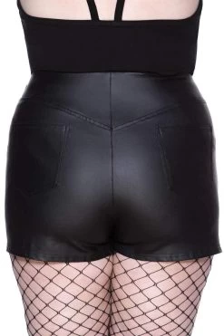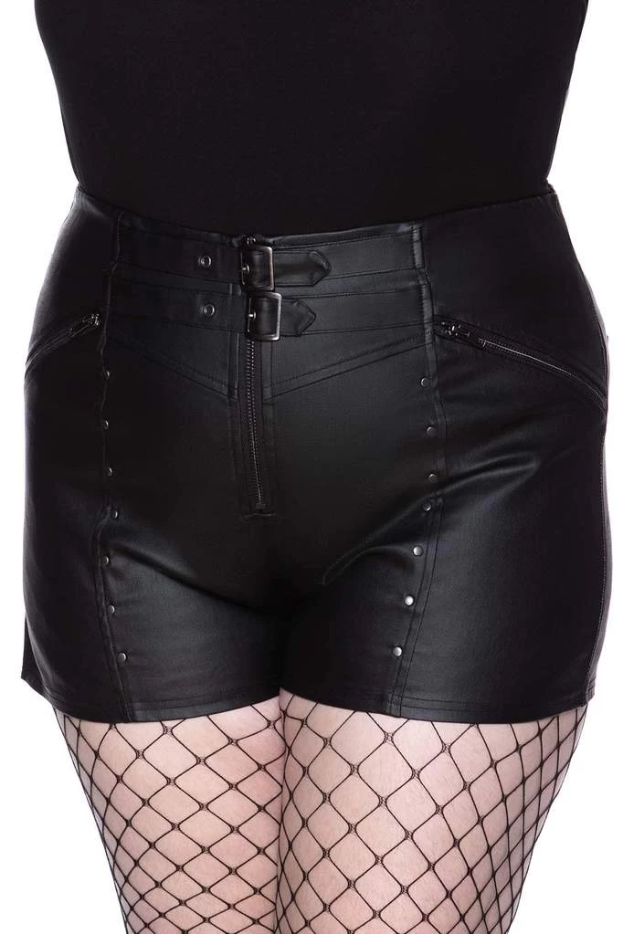 A perfect blend of naughty and nice – ‘Nemesis’ shorts. Fitted body in faux leather, with zip + buckles, zips and studs details and back pockets. Wide waistband. A perfect core piece and a must-have for your dark wardrobe!