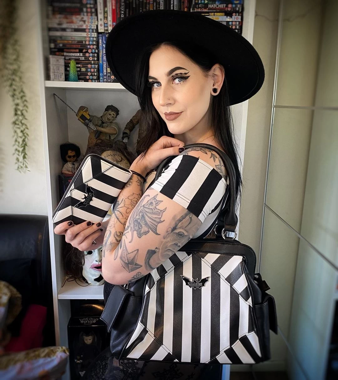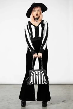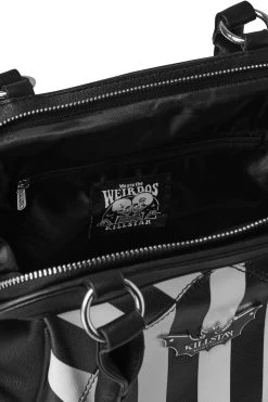 Elevate yer handbag game with this statement must-have; ‘Never Trust The Living’ is finished in a faux leather body adorned with a block-stripe print, branded bat plaque, multiple storage pockets, and zip closure. Detachable shoulder strap when you need it and of course fully lined. Halloween is every day!