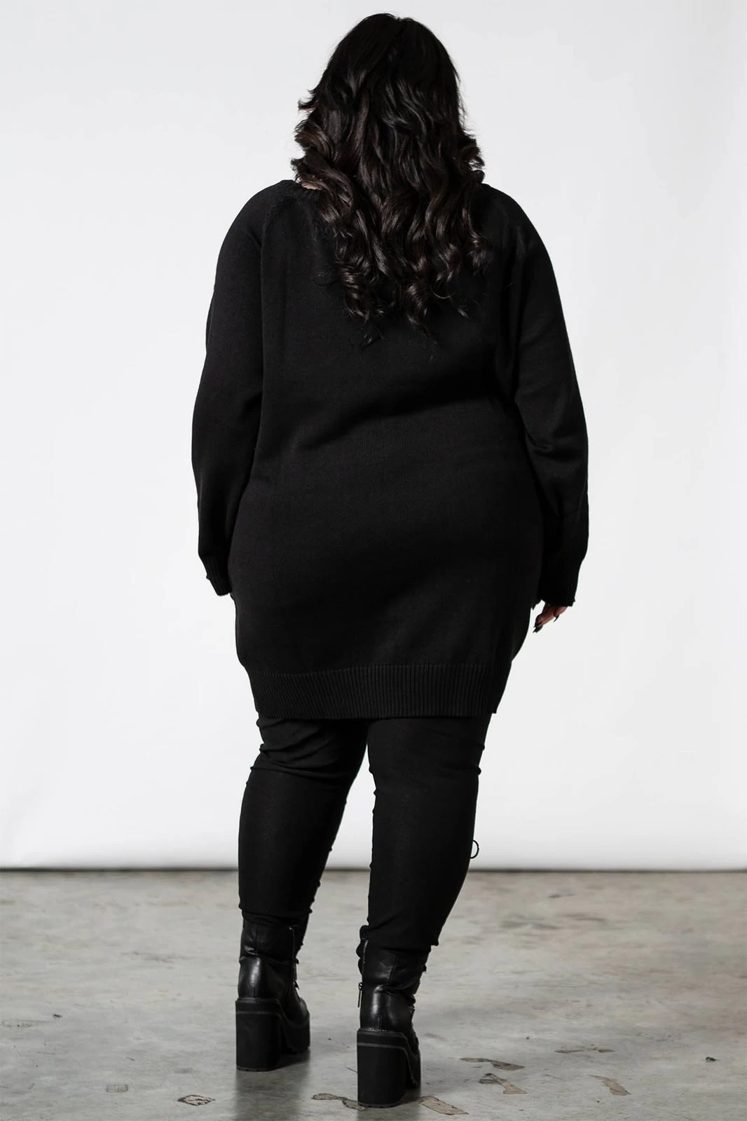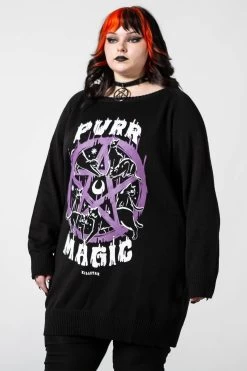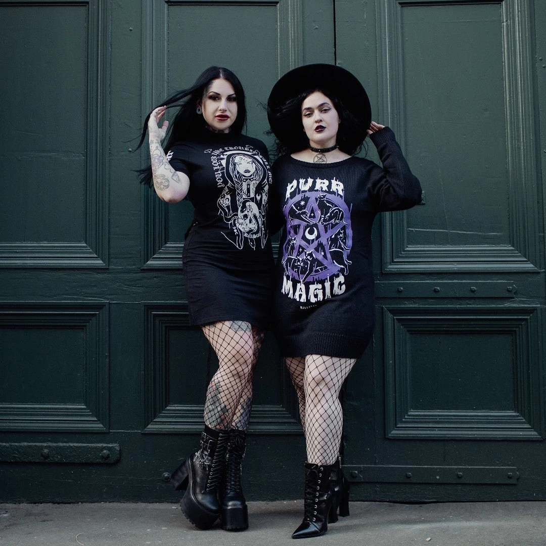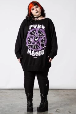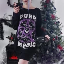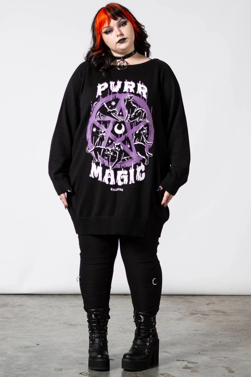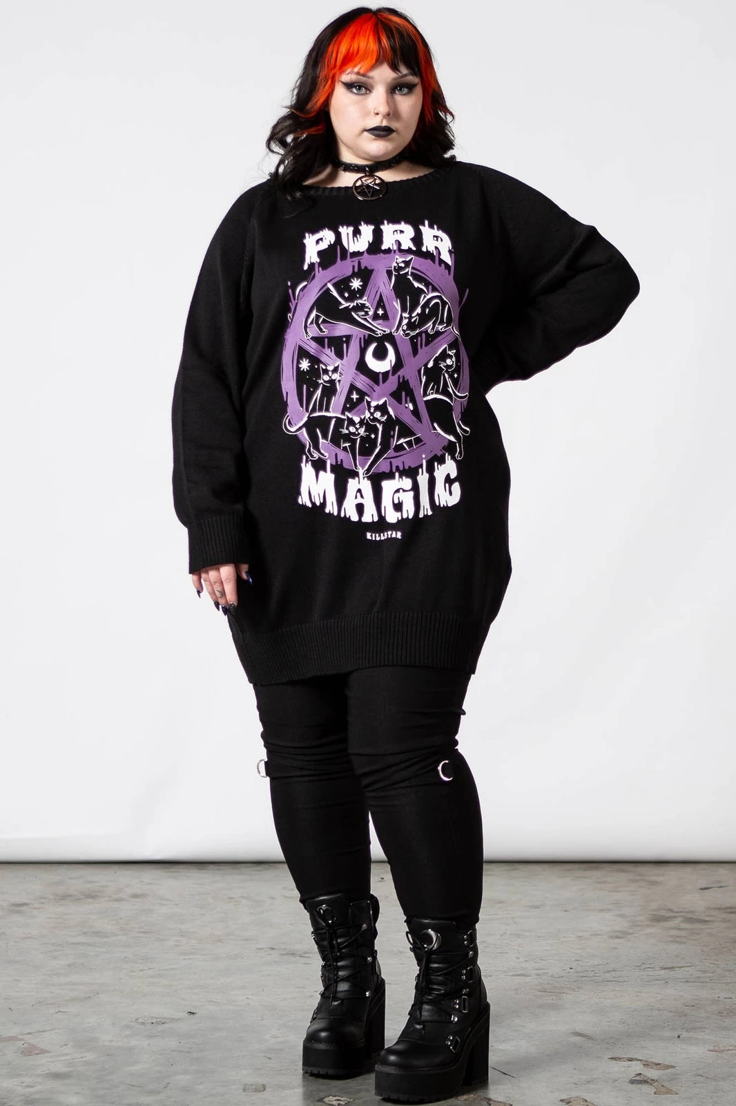 Look cute as hell in the ‘Purr Magic’ knit sweater; conjured using a super-soft fabric for a flattering yet comfortable fit. Features a wide neckline, statement graphic on the front and long sleeves – no detail has been spared! This creepy lil staple piece is a dream to style and looks great with all your fav lookz! Purrrfect for a day out with your Coven or picnics by the moon!