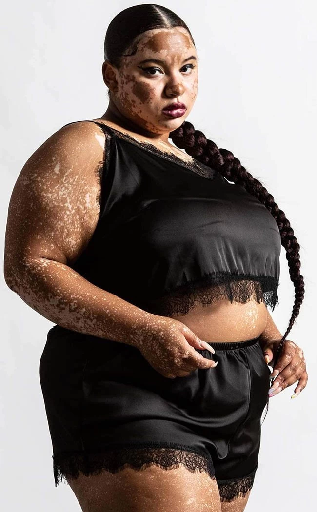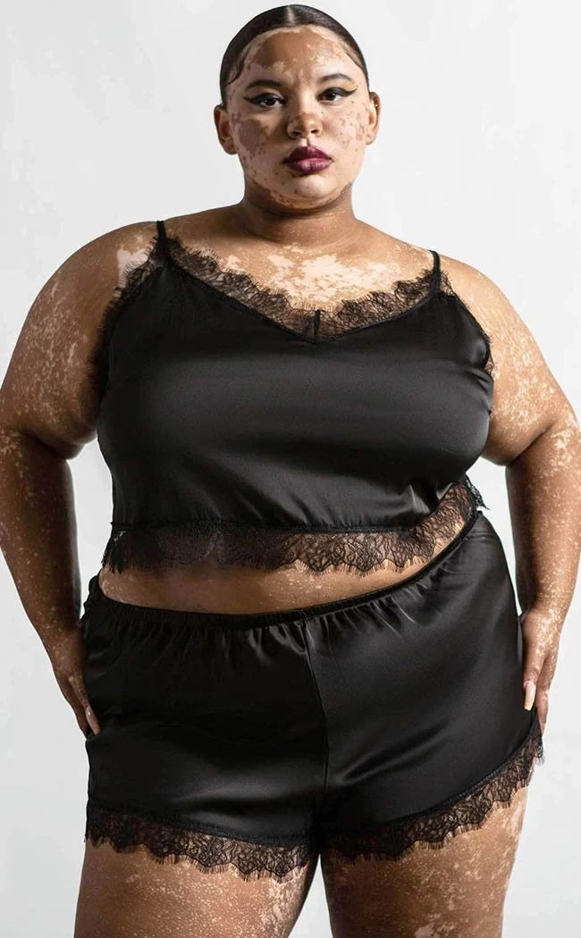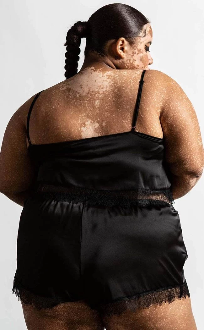 Keep a few z’s up yer sleeves with the Lace of Spades satin set! The cami and shorts feature matching soft satin and lace trims. The super stretchy waistband and adjustable straps ensure you’ll be cosy while you’re lounging around, sleeping your cares away or seducing your sleep paralysis demons.