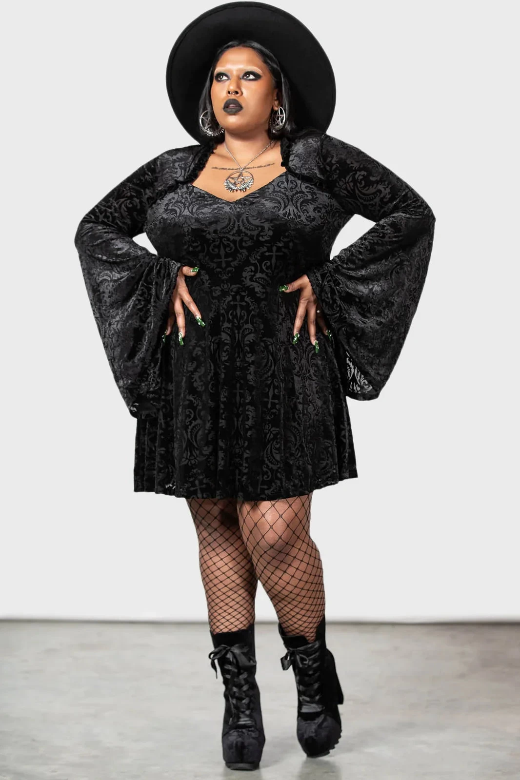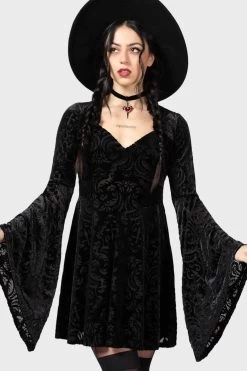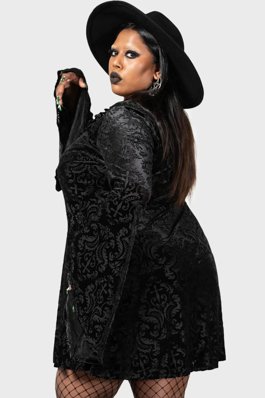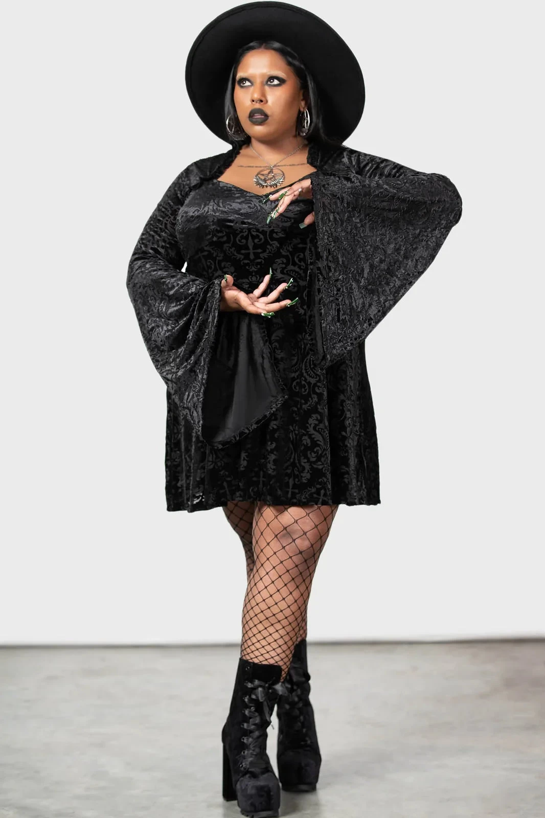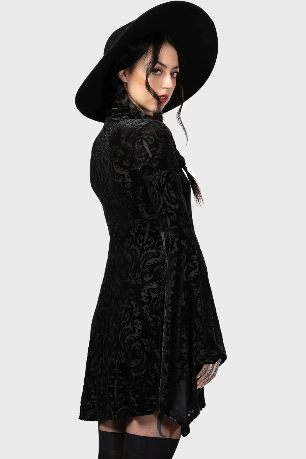 – Long flared sleeves.