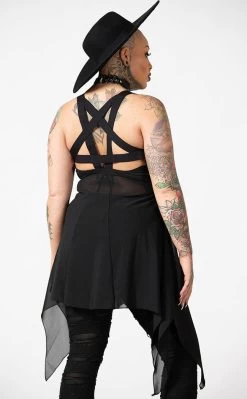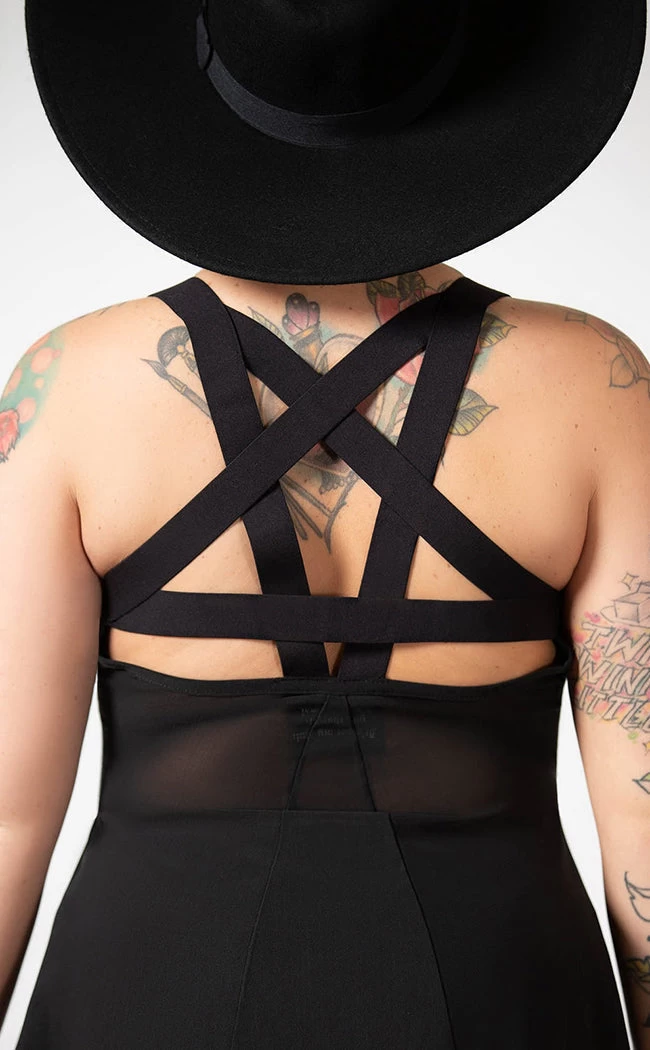 Now off your natural allure in the Lilith’s Blood Mesh Tunic Vest. Soft, flowing stretch mesh forms this longline tunic, layered like sheets of shadow. This number features a scoop neckline and pentagram straps at the back to make an extra witchy statement.